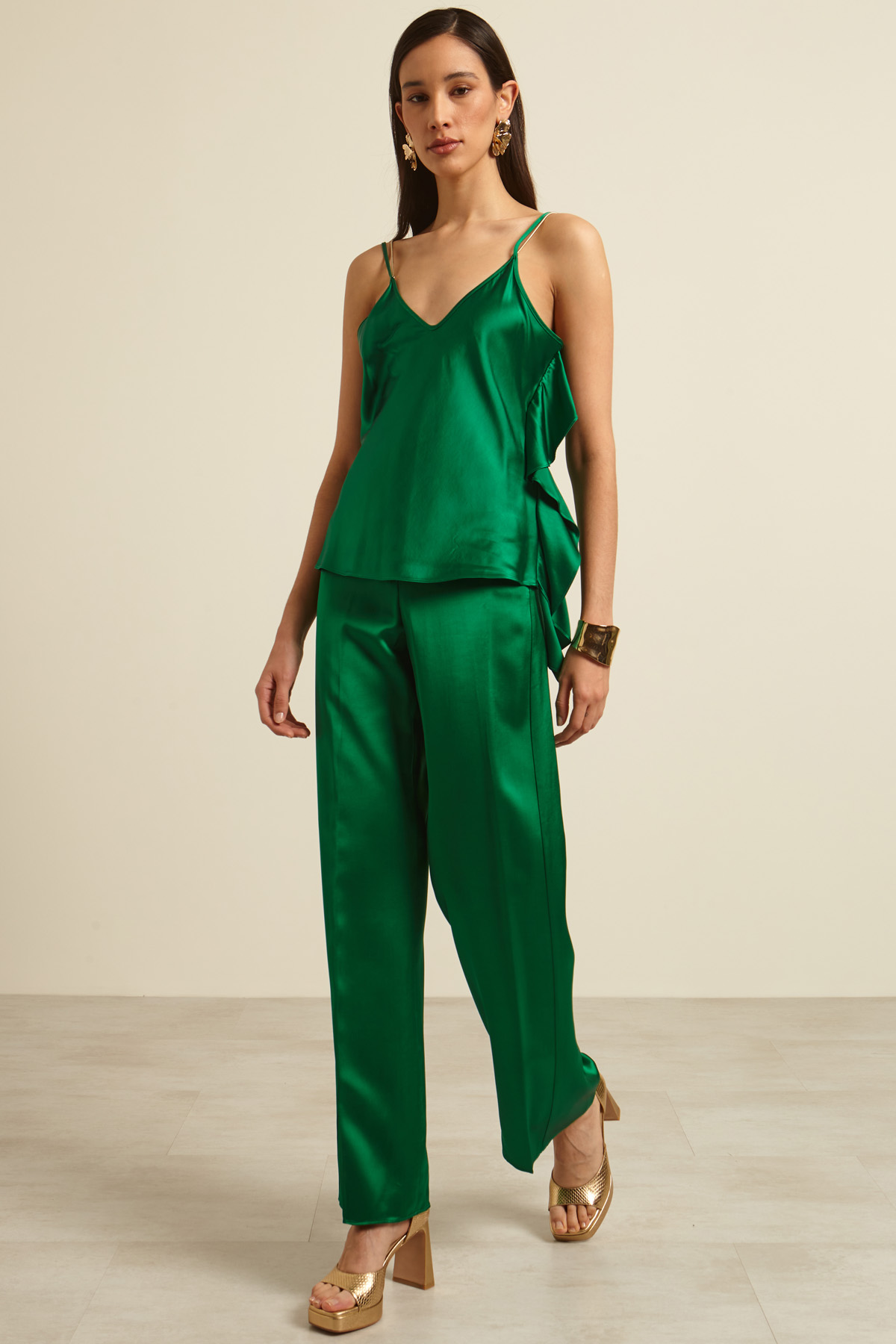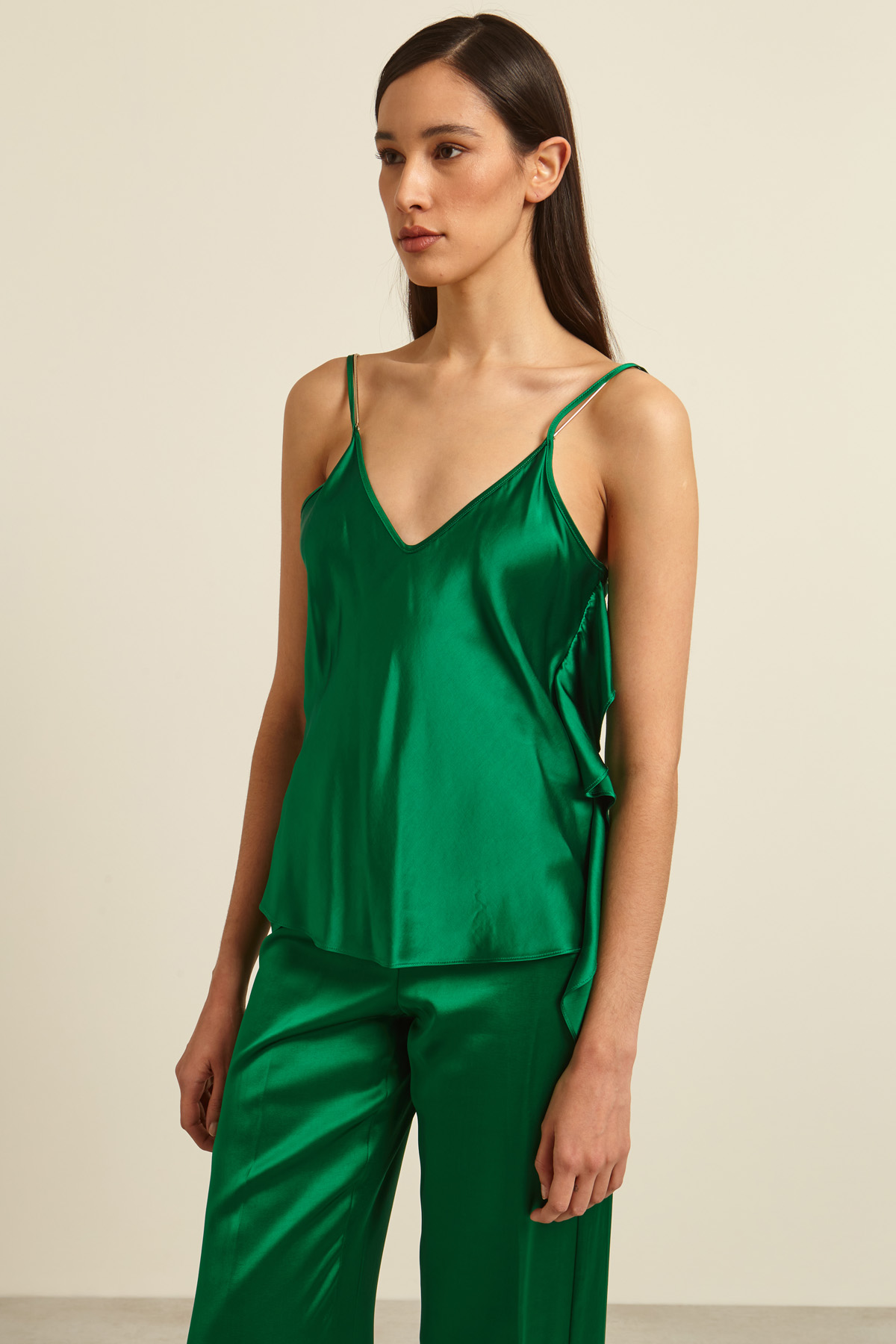 Canotta dalla linea fluida realizzata in satin di viscosa con scollo a V, doppie spalline sottili metalliche e di tessuto e volant laterale.