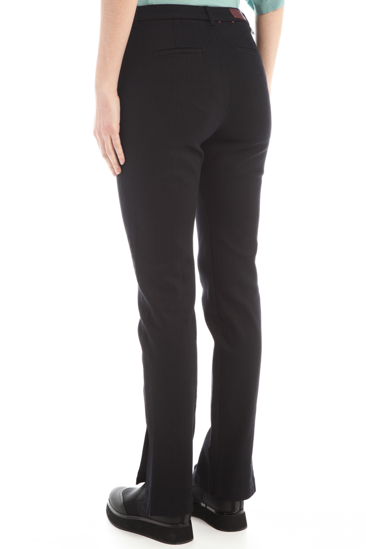 Jeans dalla linea semiaderente realizzati in denim stretch, con passanti in vita, tasche laterali alla francese e a filetto dietro, spacchi al fondo. Chiusura nascosta tramite zip bottone e gancio.