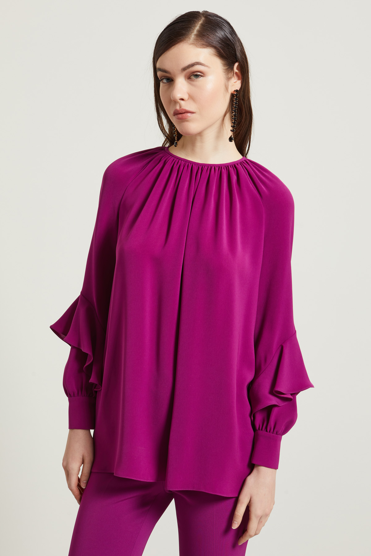 Blusa dalla linea fluida realizzata in cady leggero, con scollo a giro rifinito da arricciatura, maniche lunghe raglan, con motivo di volant, polsino e bottoni al fondo, apertura a goccia con bottone nel retro.