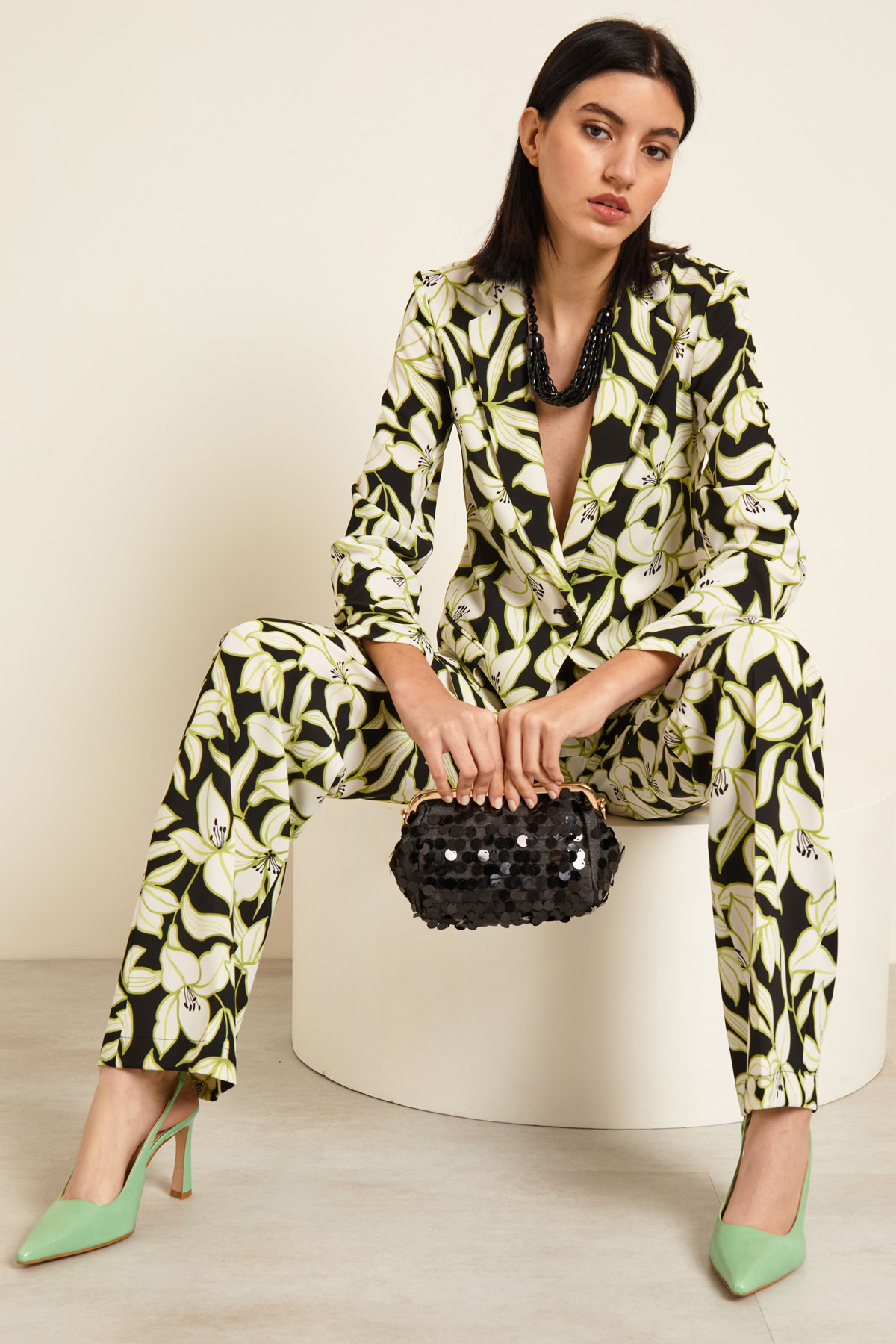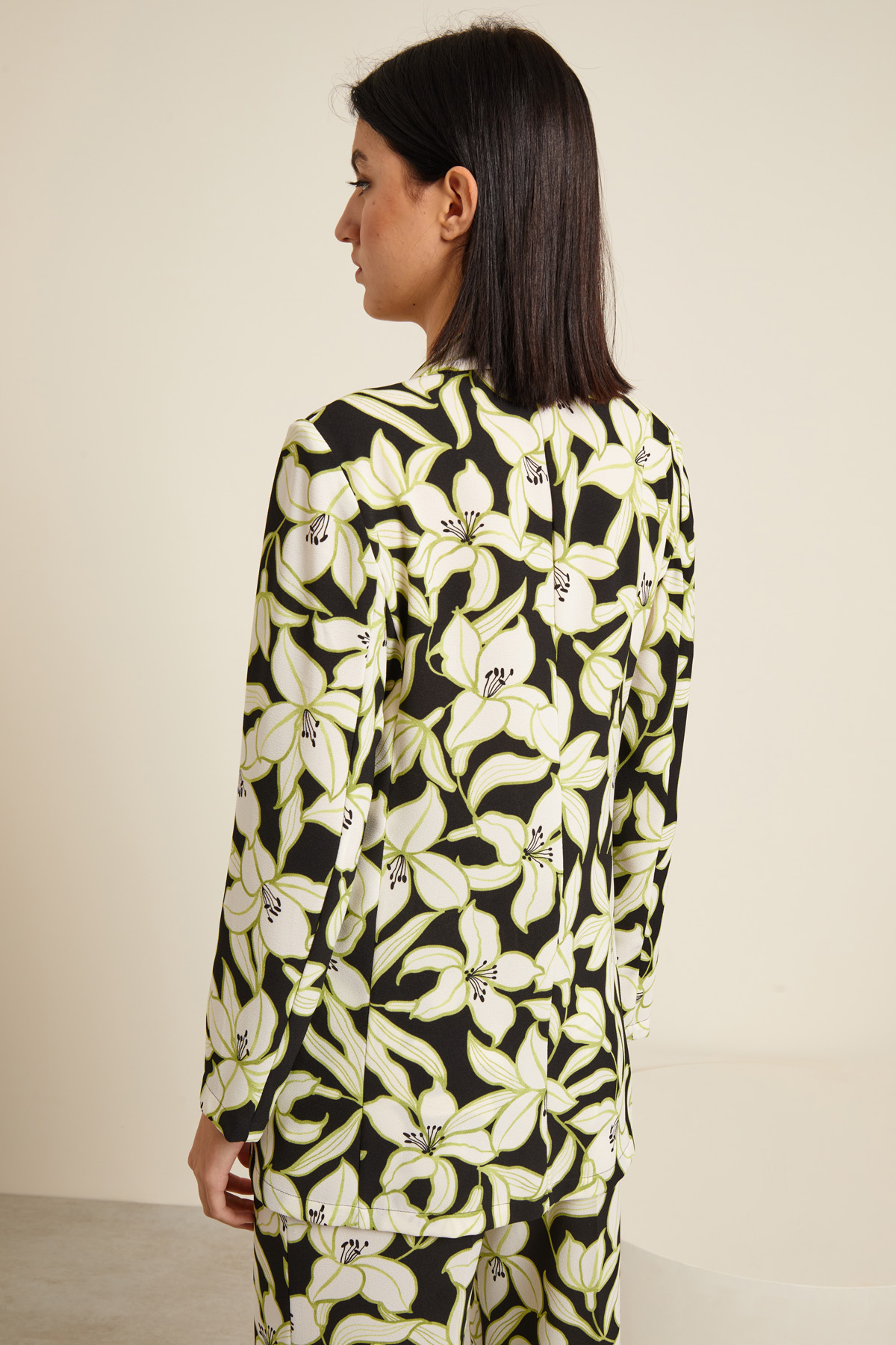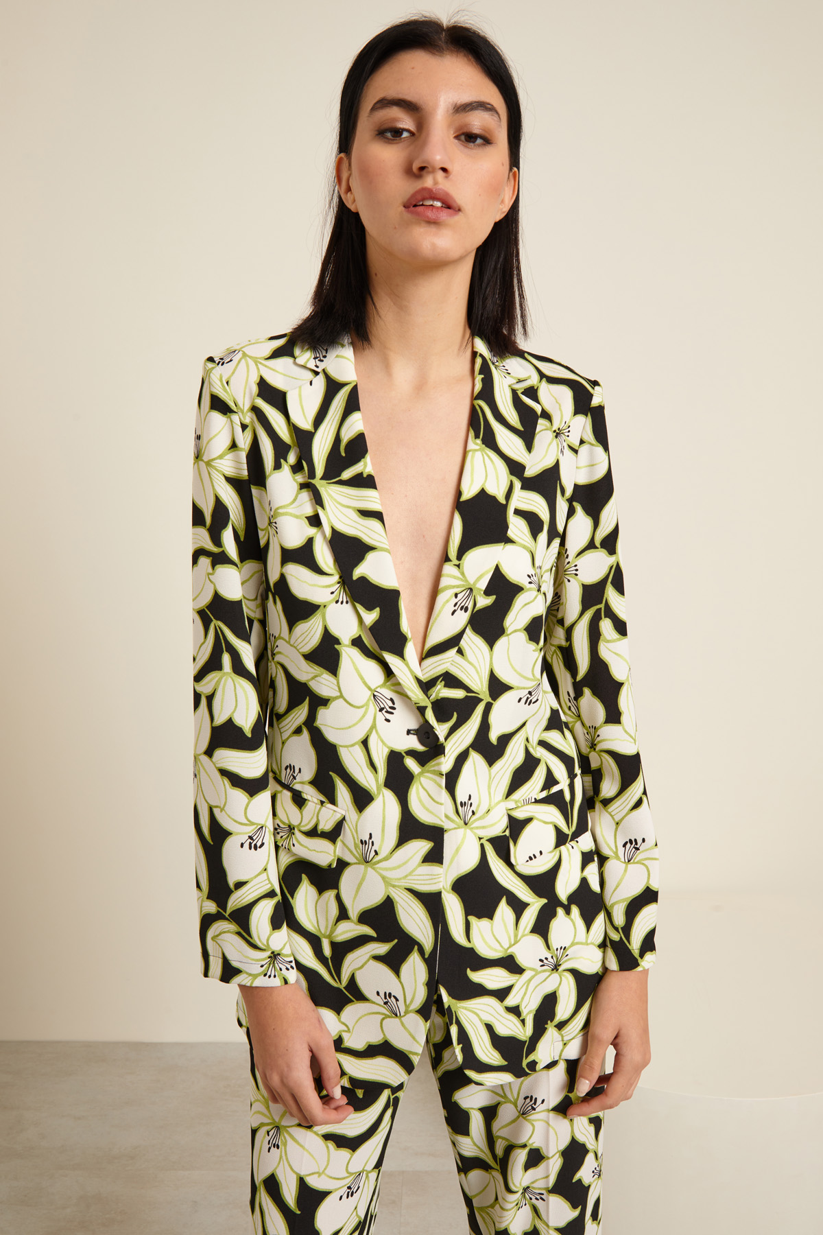 Giacca in tessuto stretch, allacciatura ad un bottone. Stampa floreale con gigli. Collo a rever, maniche lunghe e tasche con patta.