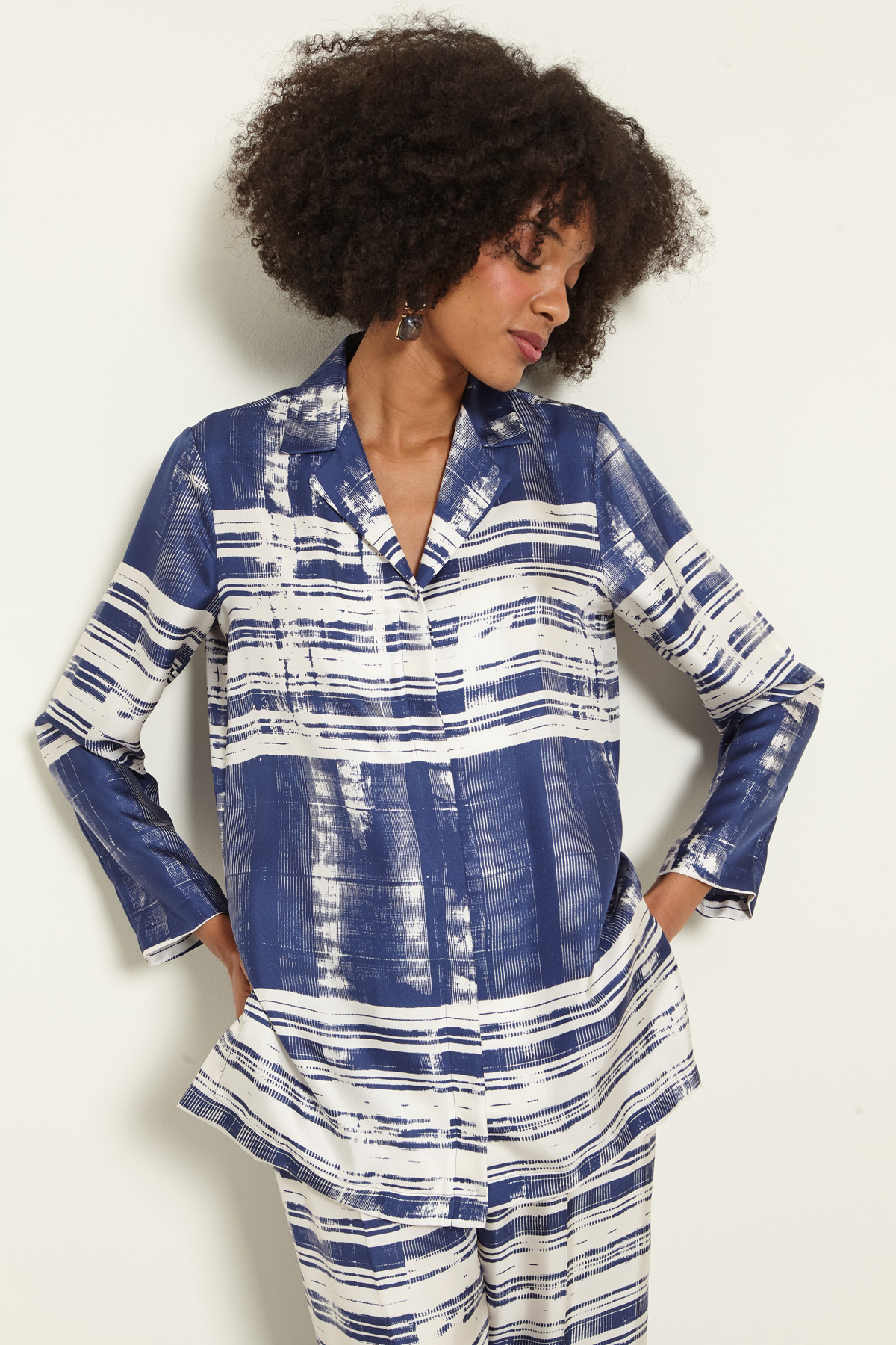 Casacca over realizzata in twill di pura seta stampata, con collo rever, maniche lunghe e spacchi laterali al fondo. Allacciatura nascosta tramite bottoni.
