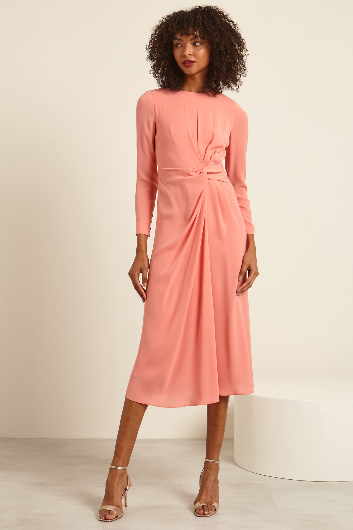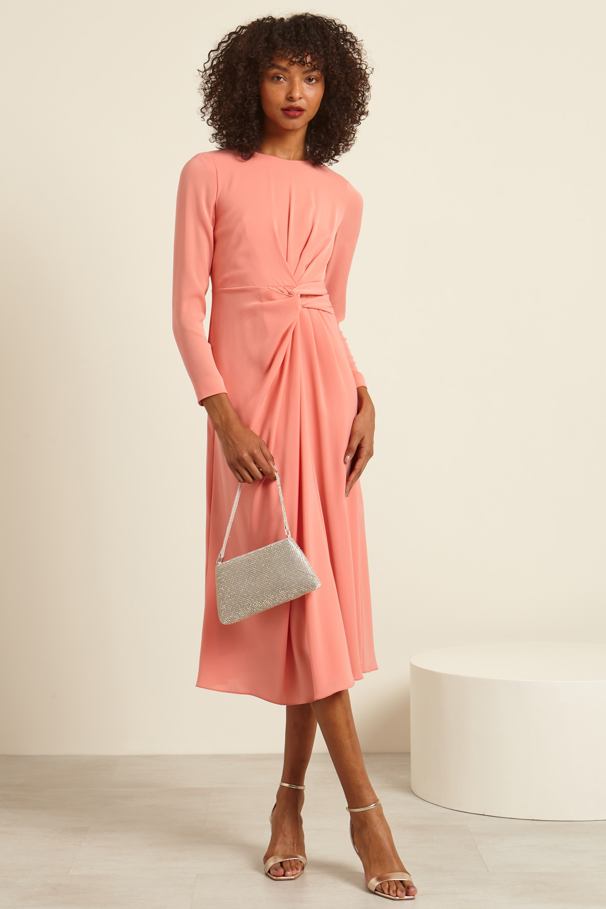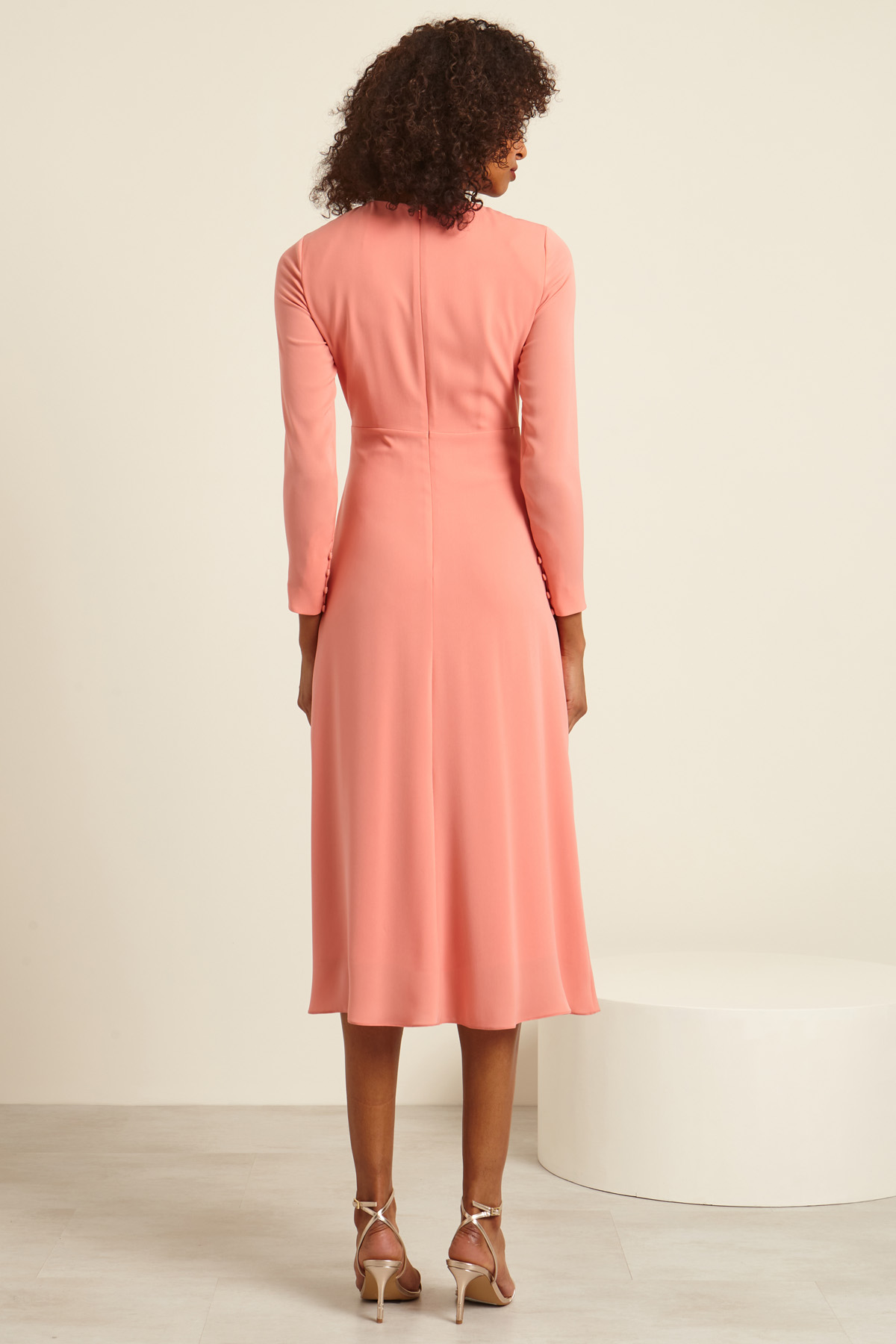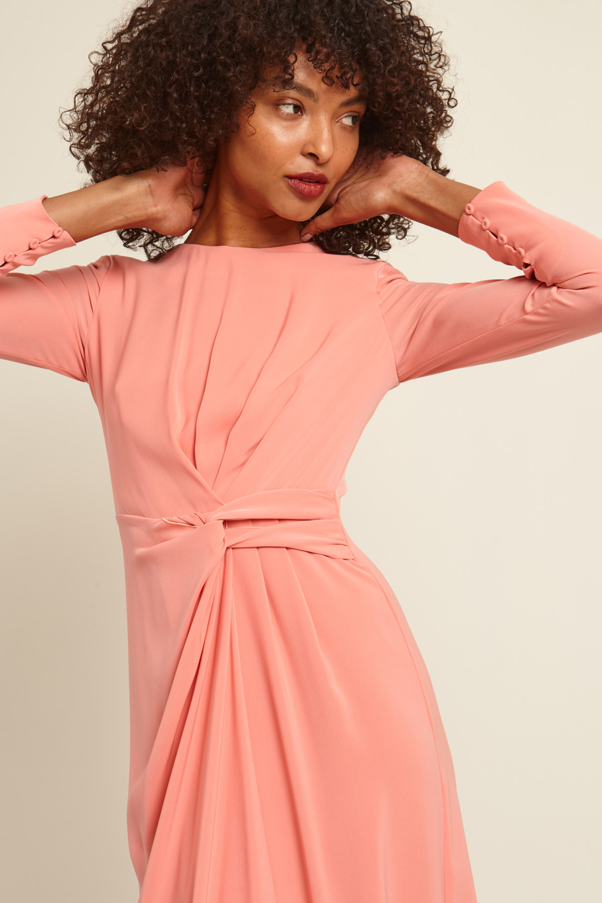 Abito lungo dalla linea fluida realizzato in cady, con scollo a giro, maniche lunghe con bottoni al fondo, dettaglio di incrocio sul davanti e allacciatura tramite zip invisibile nel retro. Foderato.