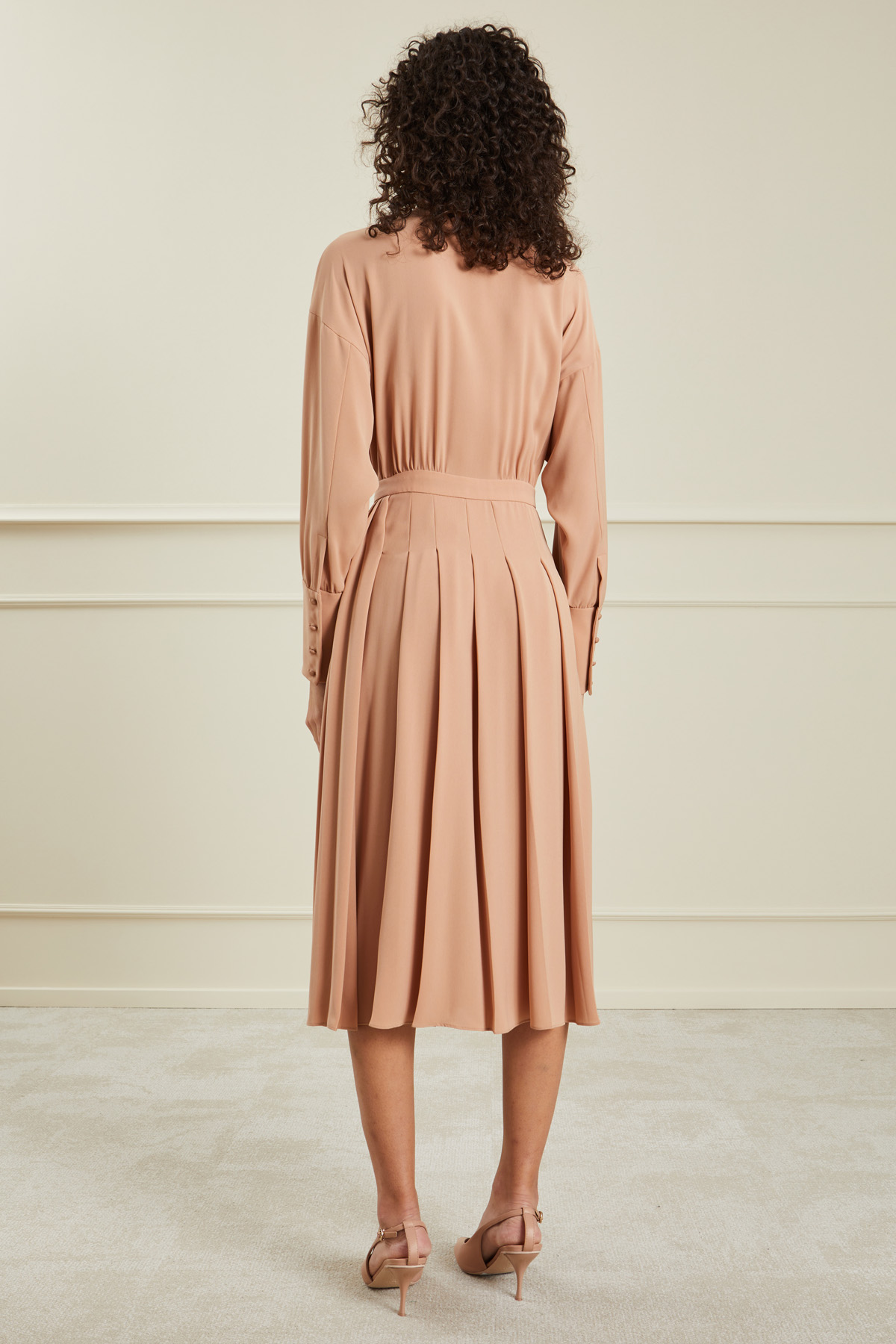 Abito dalla linea fluida realizzato in cady, con colletto alla coreana, maniche lunghe con polsino alto e bottoni, apertura nascosta tramite bottoni sul davanti, cintone in vita e gonna a pieghe. Allacciatura tramite zip invisibile sul fianco.