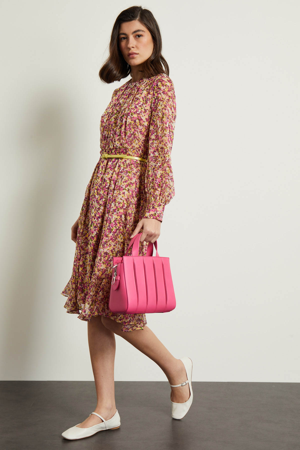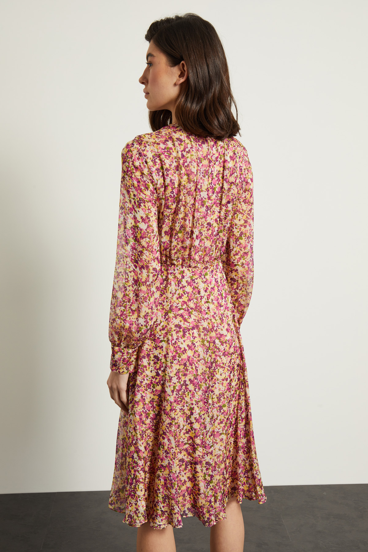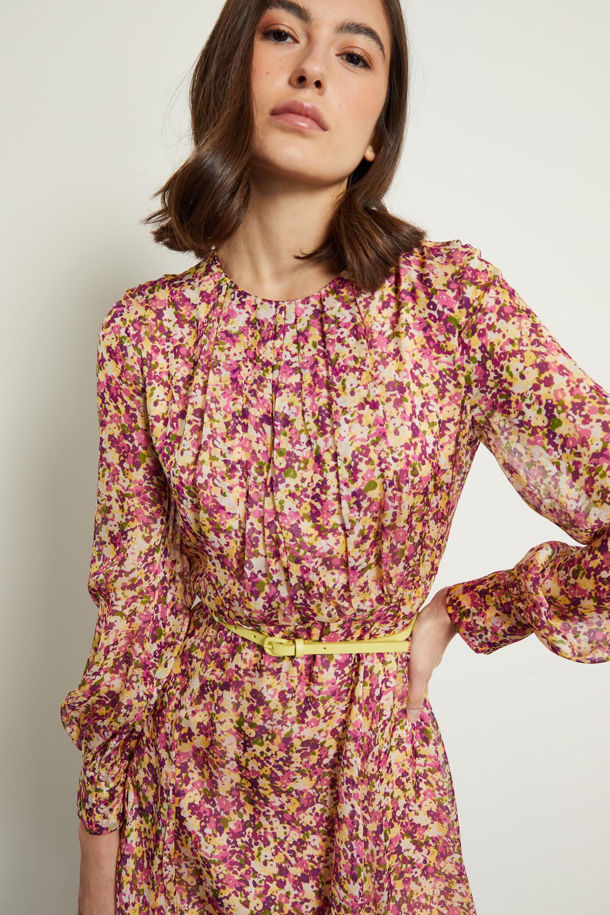 Abito midi dalla linea fluida realizzato in chiffon di pura seta stampata, con scollo a giro, motivo di pieghe cucite sul davanti, maniche lunghe con polsino e bottoni. Allacciatura tramite zip invisibile nel retro. Capo dotato di cintura in abbinamento. Semifoderato.