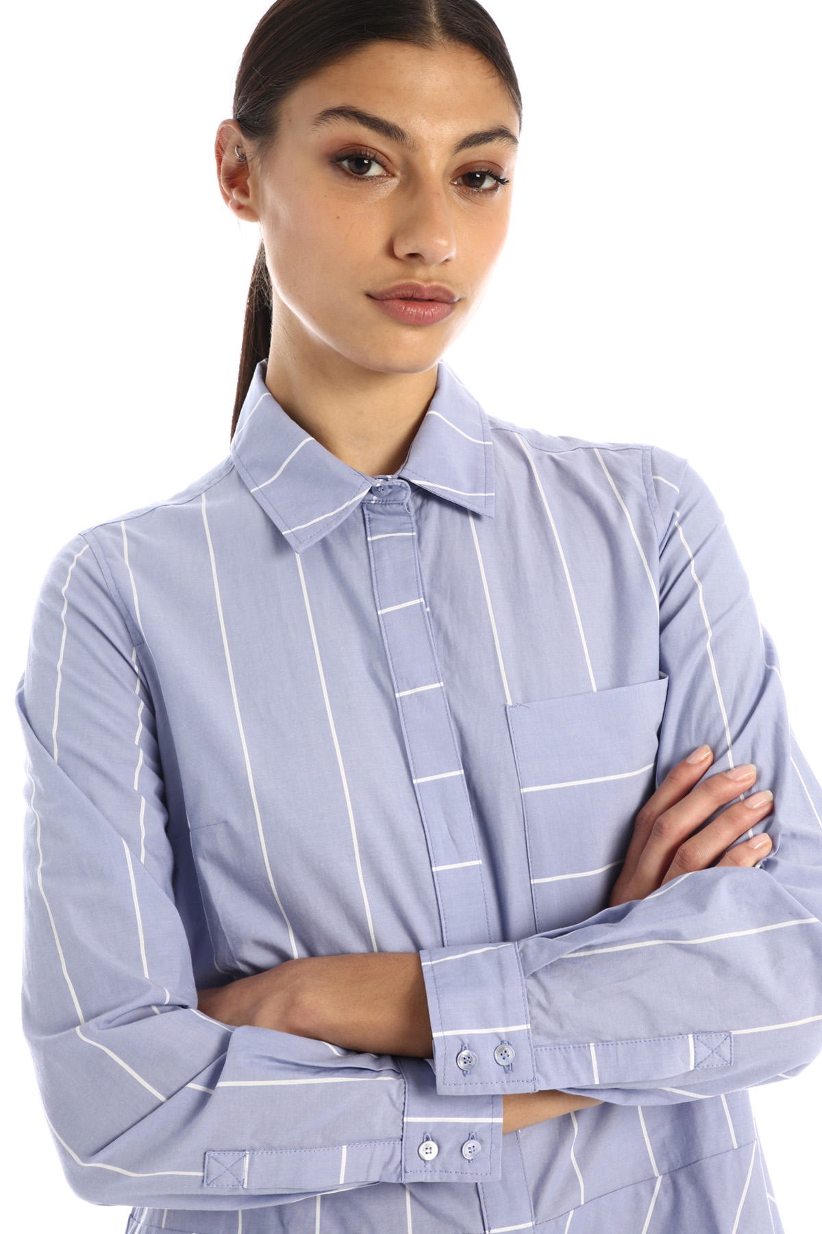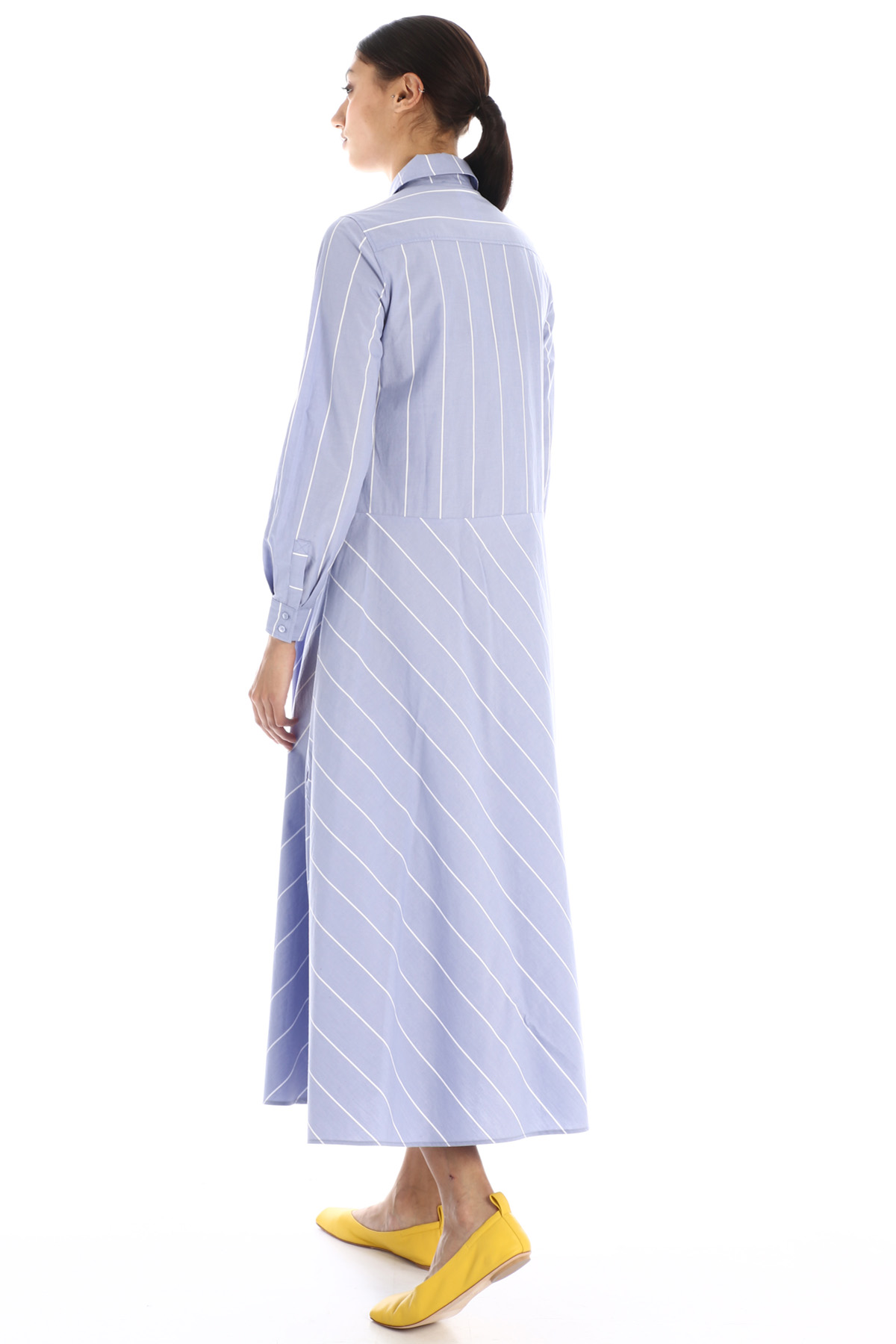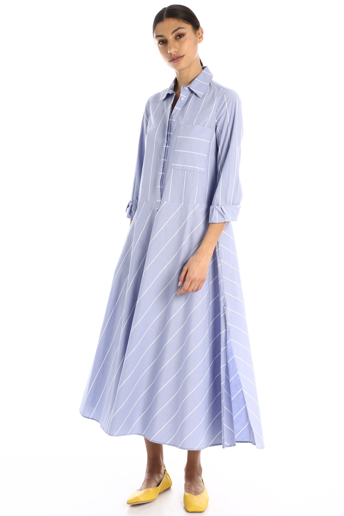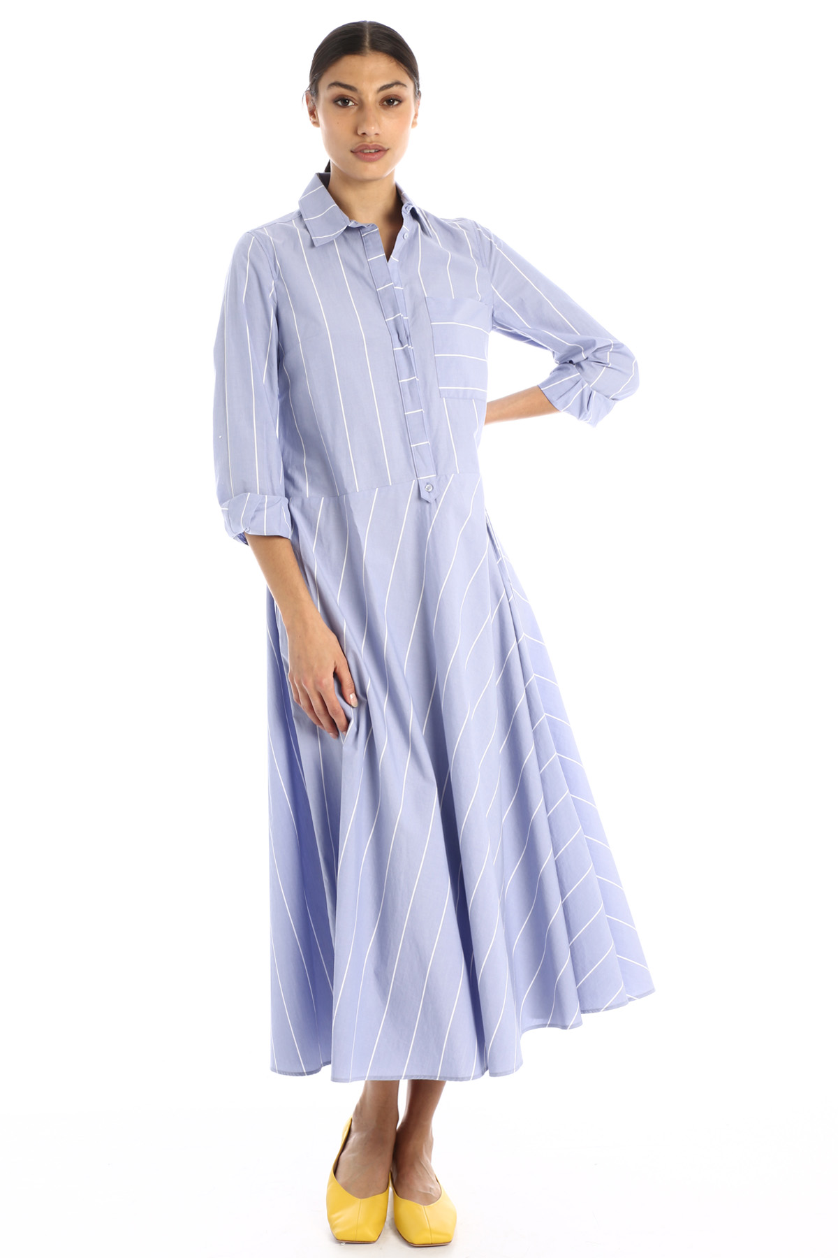 Abito chemisier dalla linea svasata al fondo realizzato in popeline di cotone, con colletto classico, maniche lunghe con polsino, taschino applicato al petto e tasche laterali inserite nella cucitura. Allacciatura nascosta tramite bottoni.