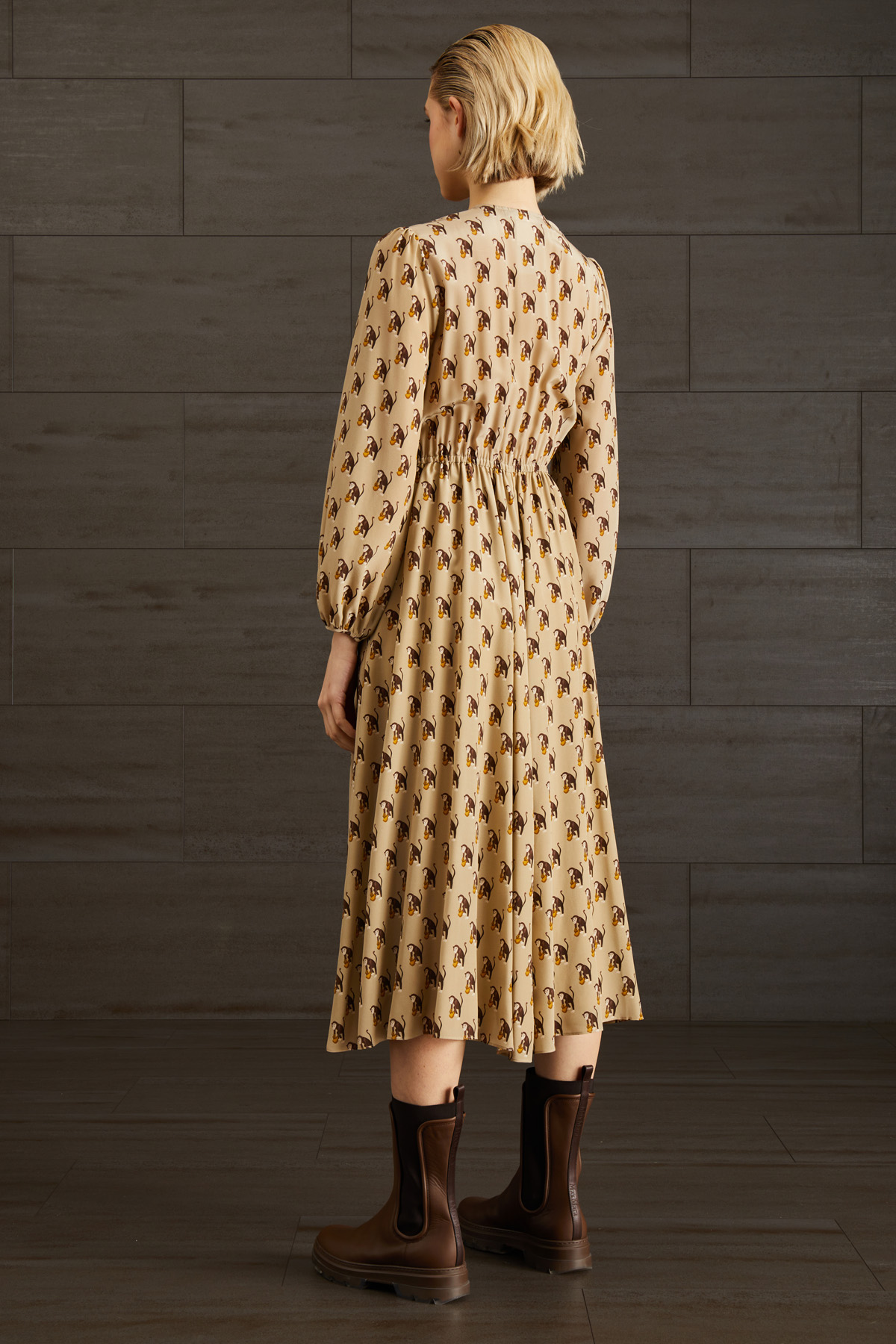Abito dalla linea svasata realizzato in crèpe de chine di pura seta, con scollo a V drappeggiato, maniche lunghe leggermente a sbuffo, inserto di elastico in vita e tasche in cucitura. Capo dotato di cintura in abbinamento. Foderato.