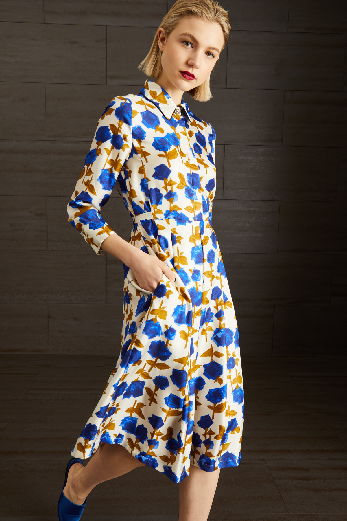 Abito chemisier dalla linea svasata realizzato in twill di pura seta stampata con inserto piping a contrasto, colletto classico e apertura , maniche lunghe e bottone gioiello, tasche inserite in cucitura e taglio in vita con nastri da annodare. Sfoderato.