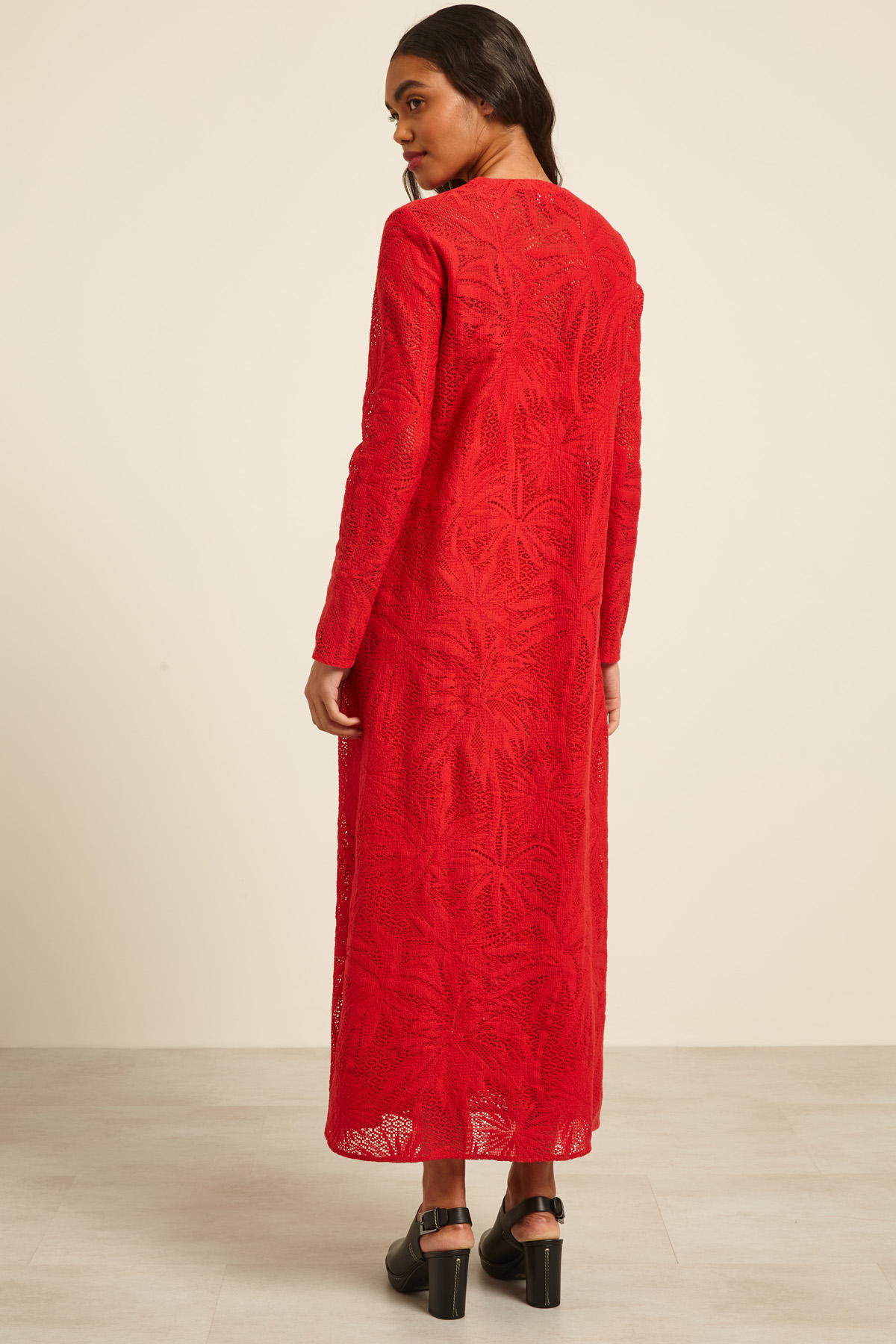 Abito lungo stile caftano realizzato in pizzo di misto cotone , scollo rotondo con apertura a V, maniche lunghe e tasche laterali inserite in cucitura. Capo dotato di sottoveste in abbinamento.