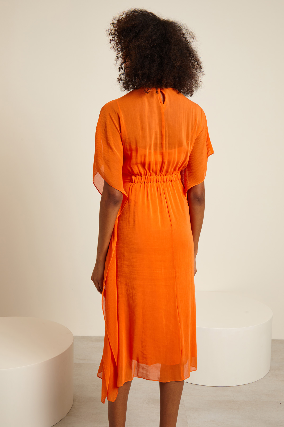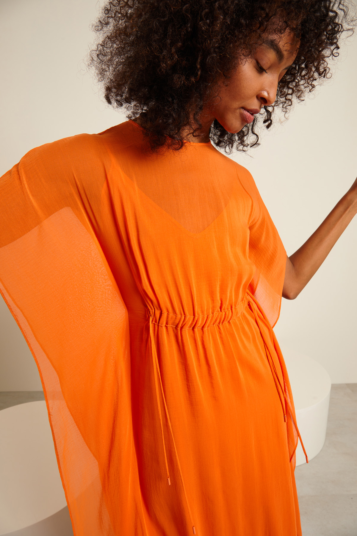 Abito kaftano realizzato in georgette di misto cotone e seta, con scollo a giro e apertura a goccia nel retro, maniche a fazzoletto, inserto elastico e coulisse, spacchi laterali al fondo. Capo dotato di sottoveste.