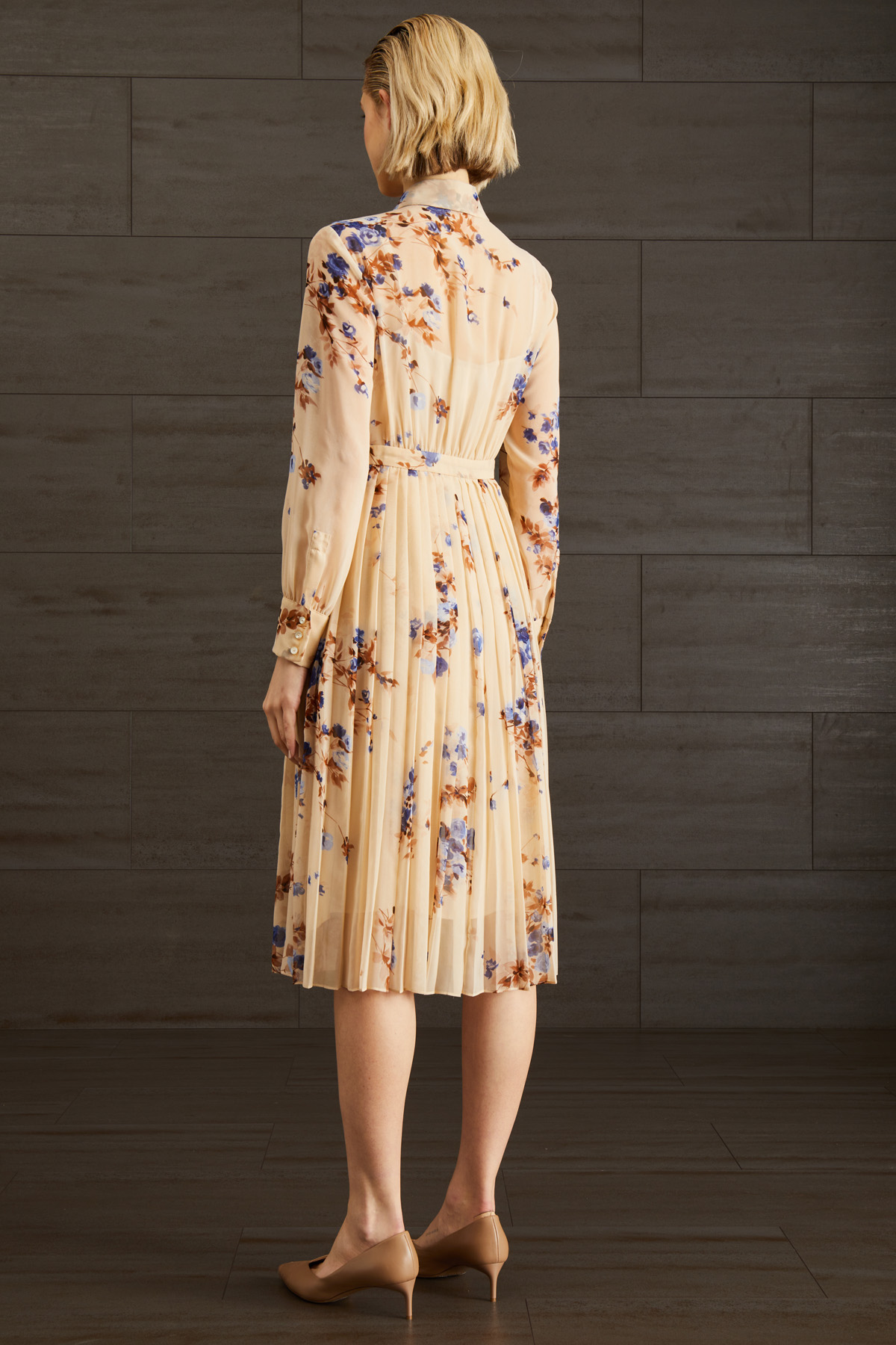 Abito chemisier dalla linea svasata realizzato in georgette stampato con motivo plissé, colletto a classico, maniche lunghe con polsino e bottoni, taglio in vita. Allacciatura nascosta tramite bottoni. Capo dotato di sottoveste.