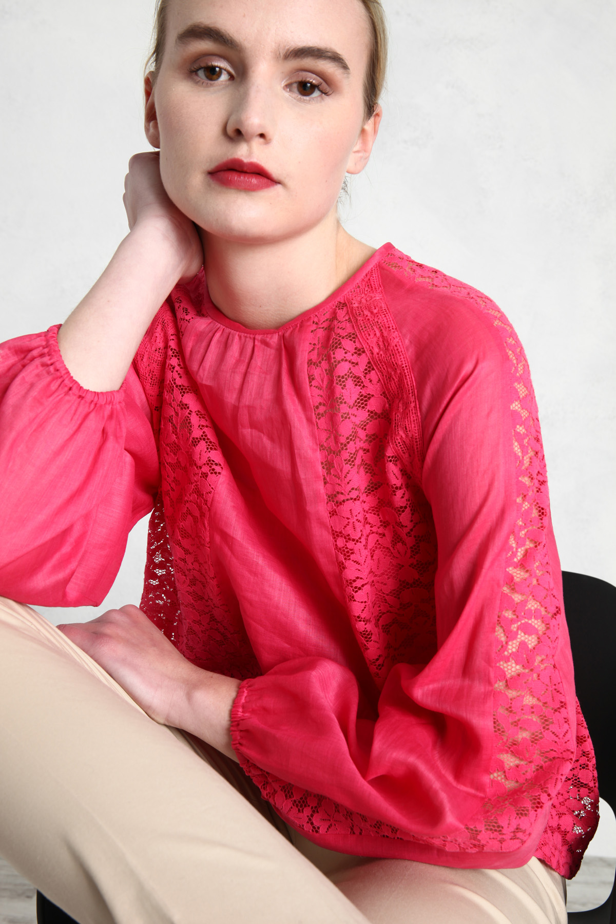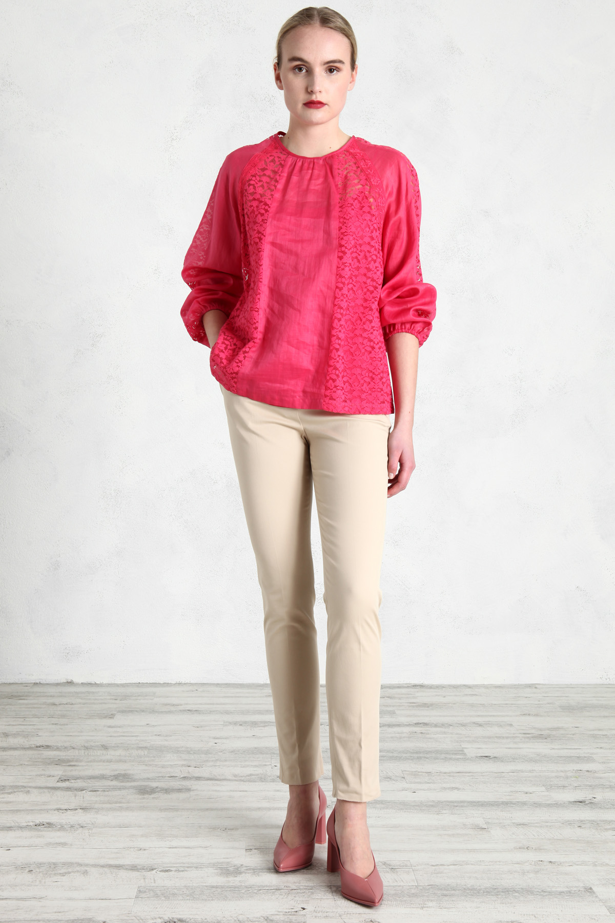 Blusa dalla linea ampia realizzata in tela di fibra naturale e pizzo, con scollo a giro, maniche lunghe raglan e allacciatura a goccia con bottone dietro. Top sottoveste abbinato.