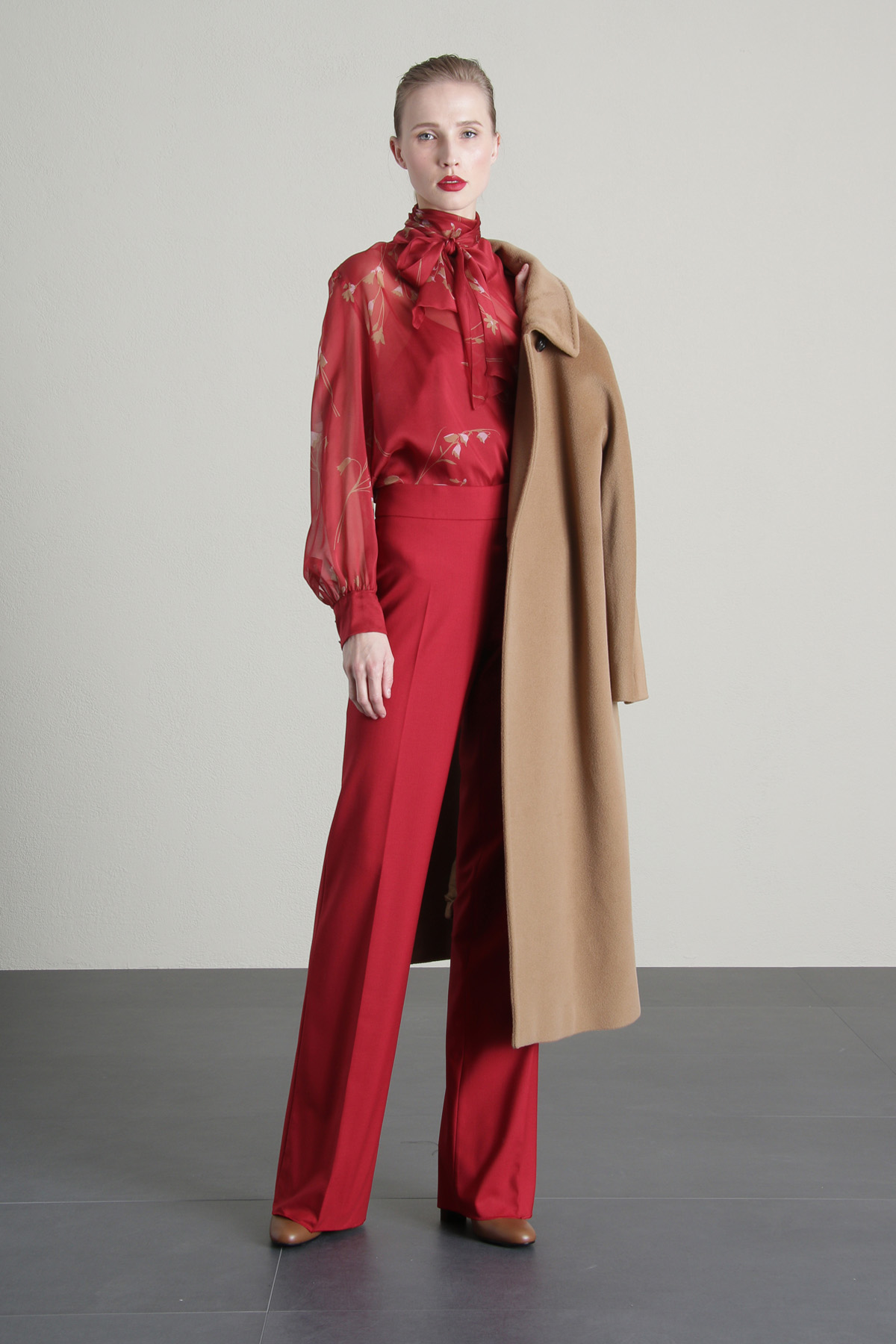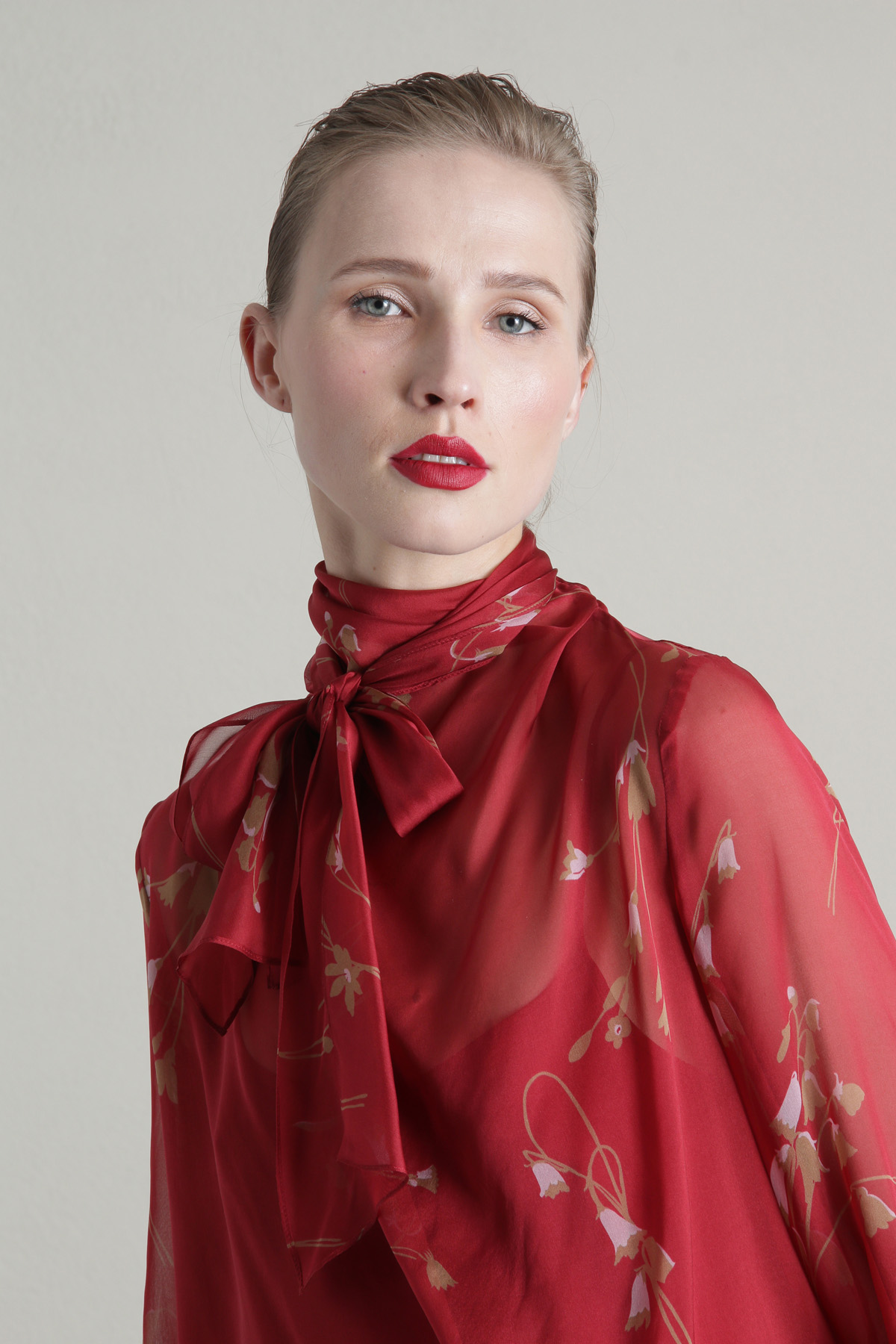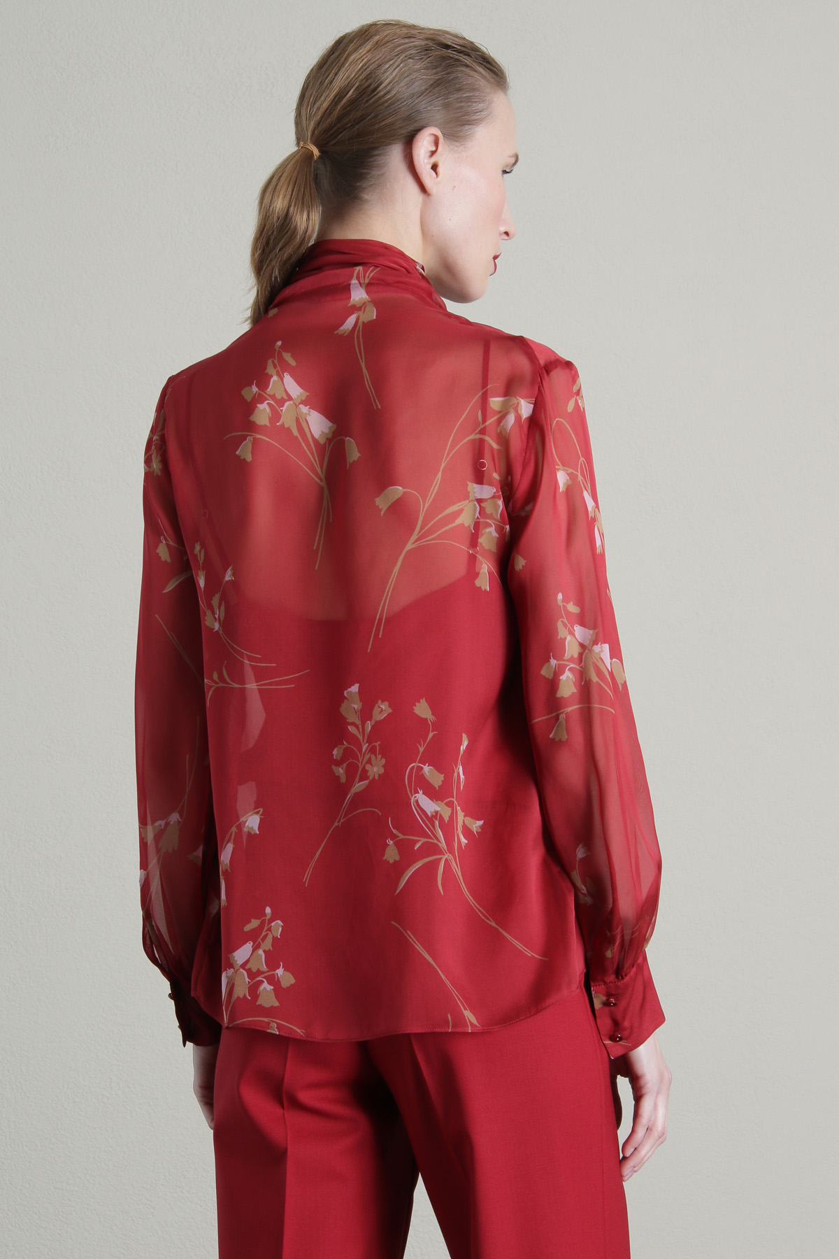 Blusa dalla linea fluida realizzata in chiffon di pura seta stampata, con collo a foulard e maniche lunghe con polsino e bottoni. Top sottoveste in abbinamento.