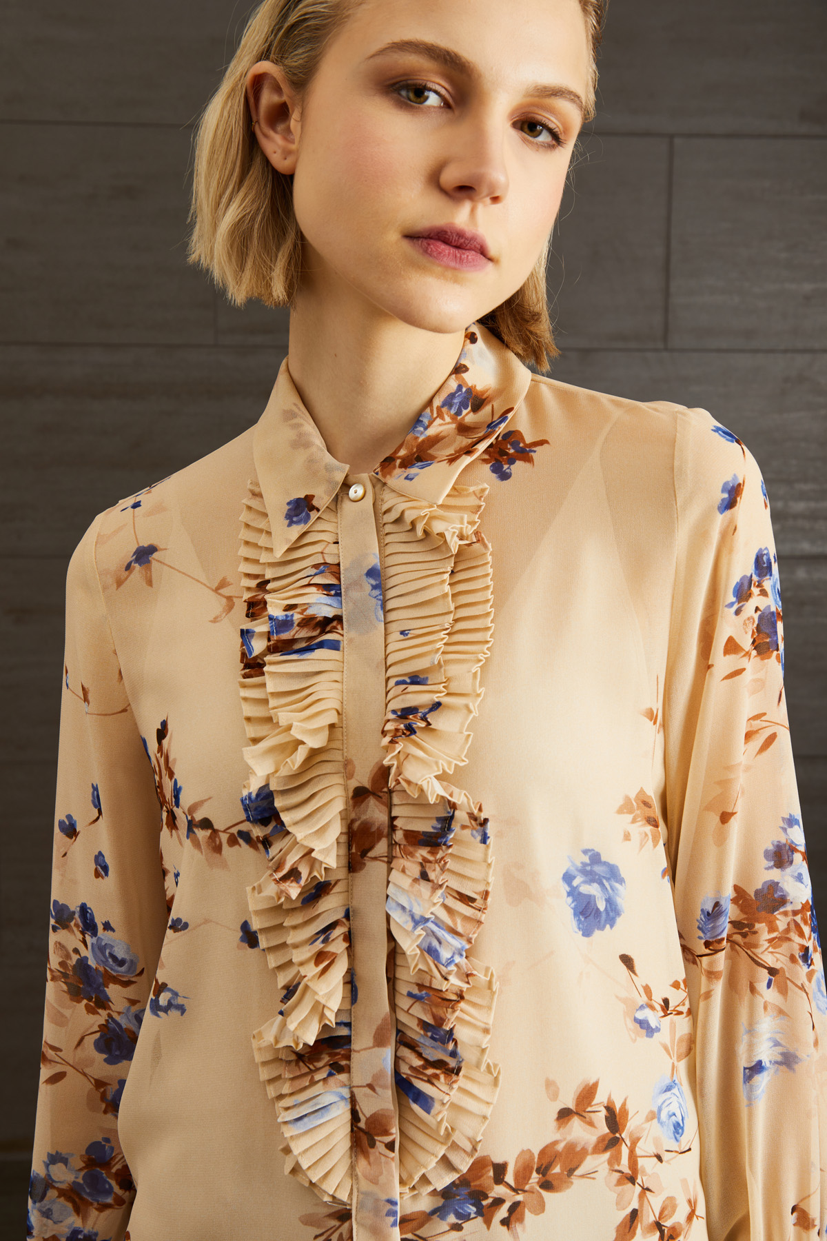 Camicia dalla linea dritta realizzata in georgette stampata, con colletto classico e dettaglio plastron plissé, maniche lunghe con polsino e bottoni. Allacciatura nascosta tramite bottoni. Capo dotato di top sottoveste.