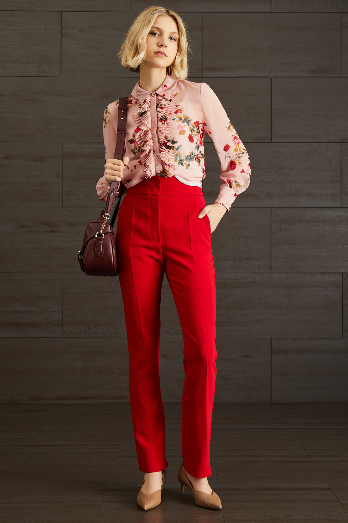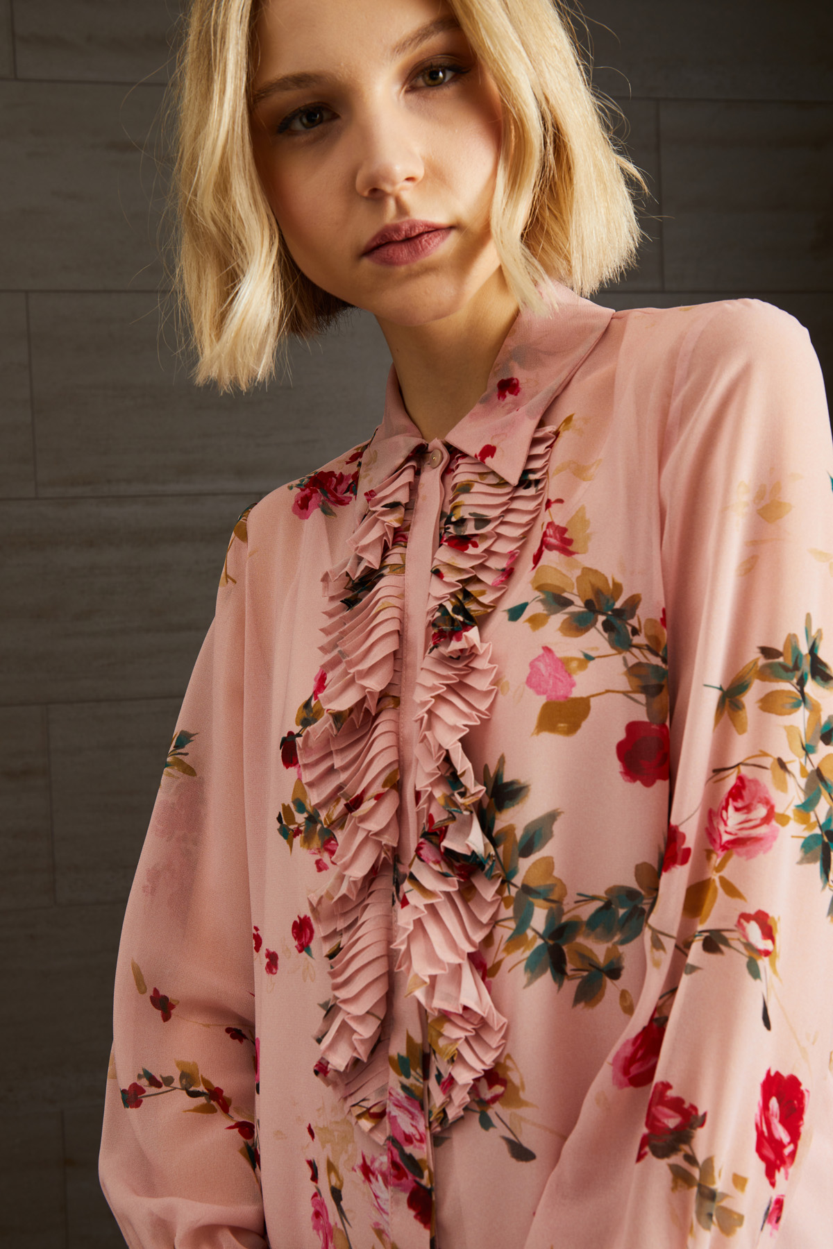Camicia dalla linea dritta realizzata in georgette stampata, con colletto classico e dettaglio plastron plissé, maniche lunghe con polsino e bottoni. Allacciatura nascosta tramite bottoni. Capo dotato di top sottoveste.