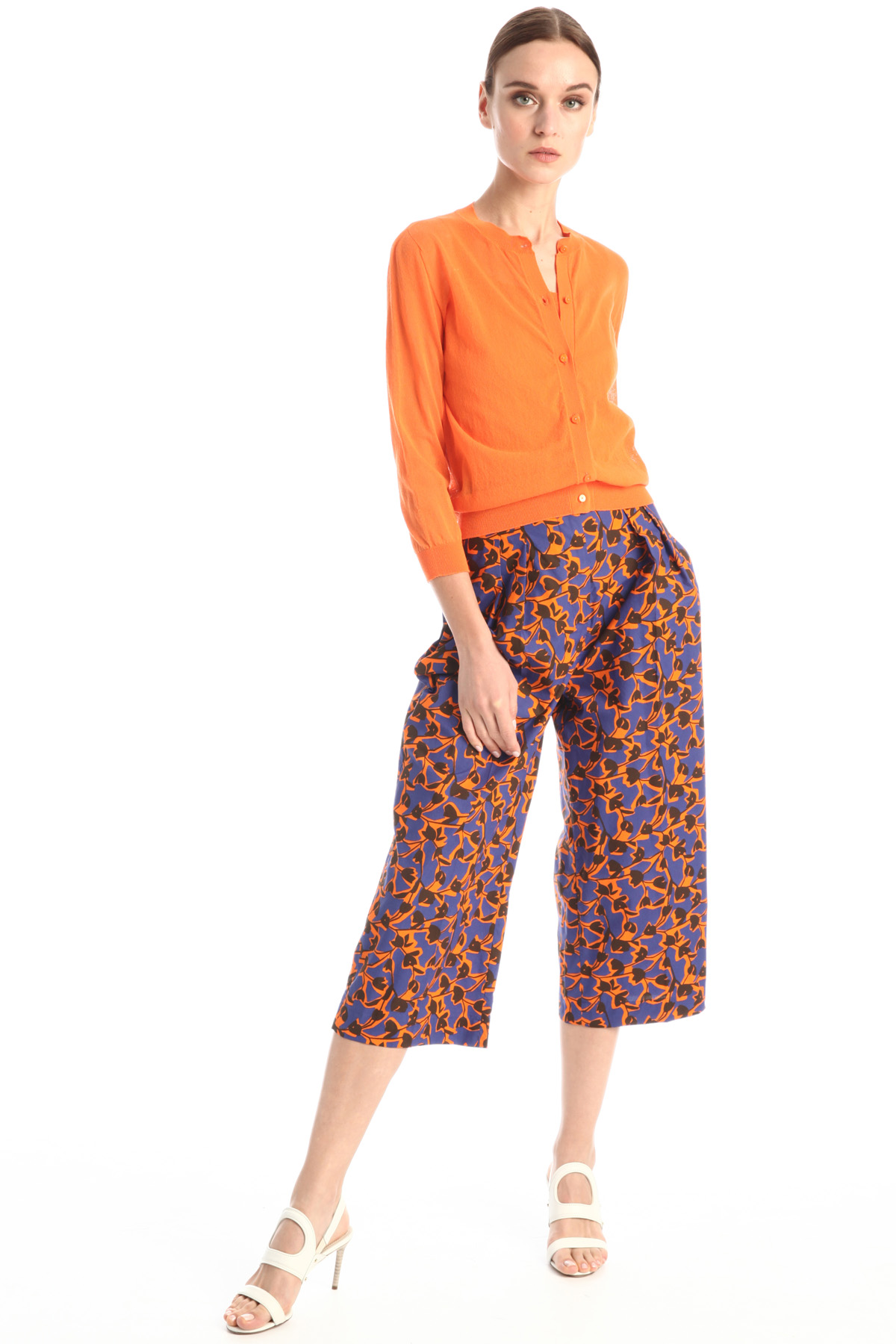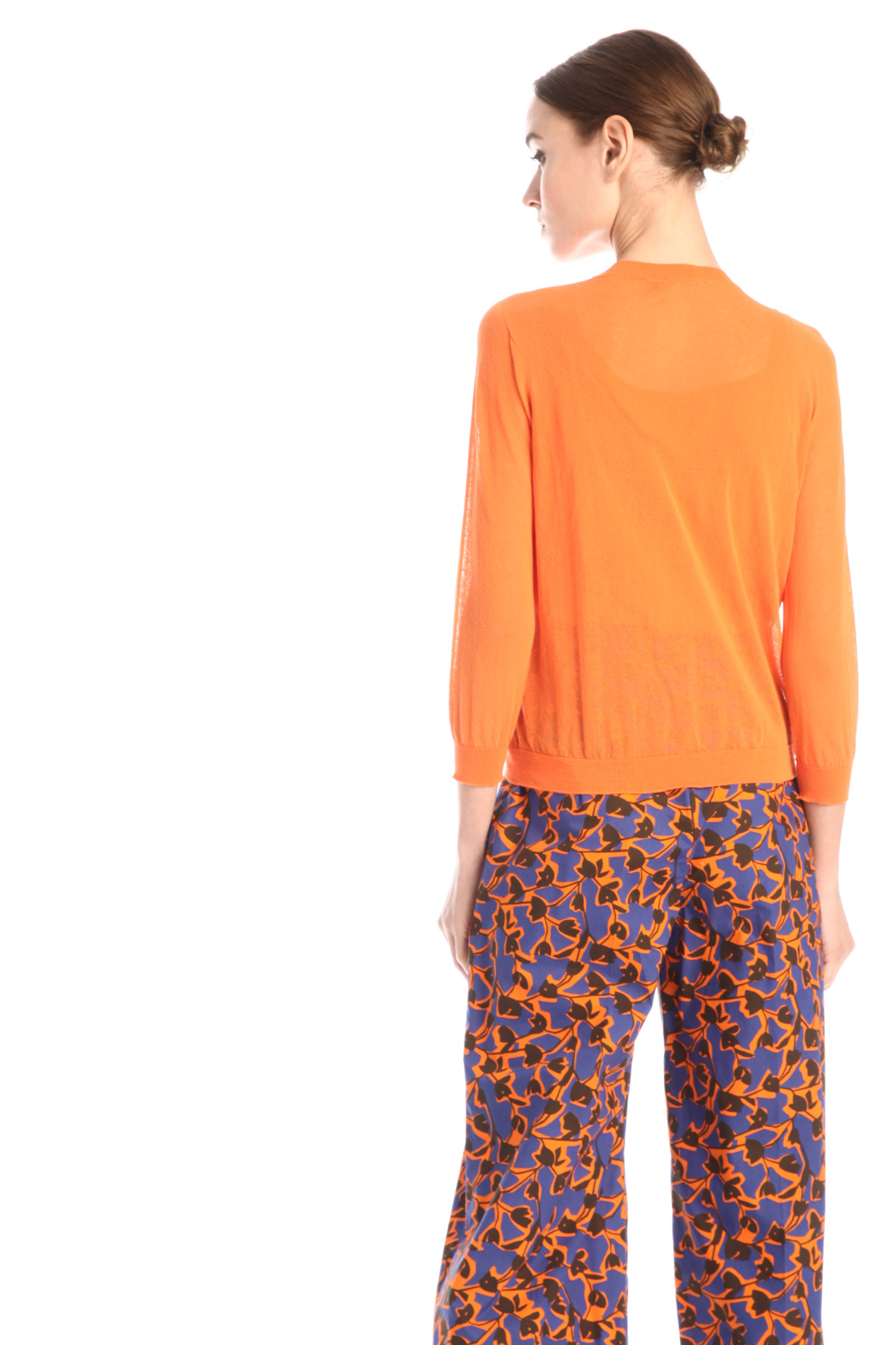Cardigan dalla linea fluida realizzato in filato misto cotone, lavorato a punto rasato, con collo a giro, maniche a tre quarti, bordi rifiniti a costine e allacciatura tramite bottoni in tono.