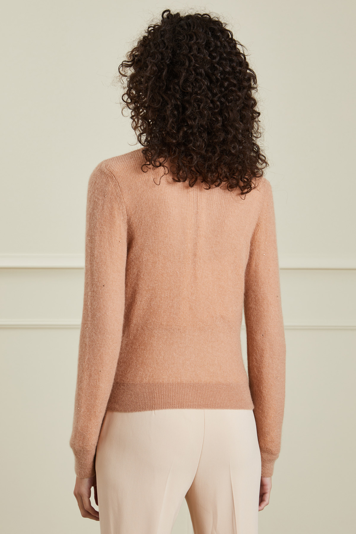Cardigan dalla linea aderente realizzato in filato di misto mohair e lana effetto garzato, con dettagli di micro strass applicati, scollo rotondo, maniche lunghe, profili rifiniti a coste e allacciatura a vista tramite bottoni.