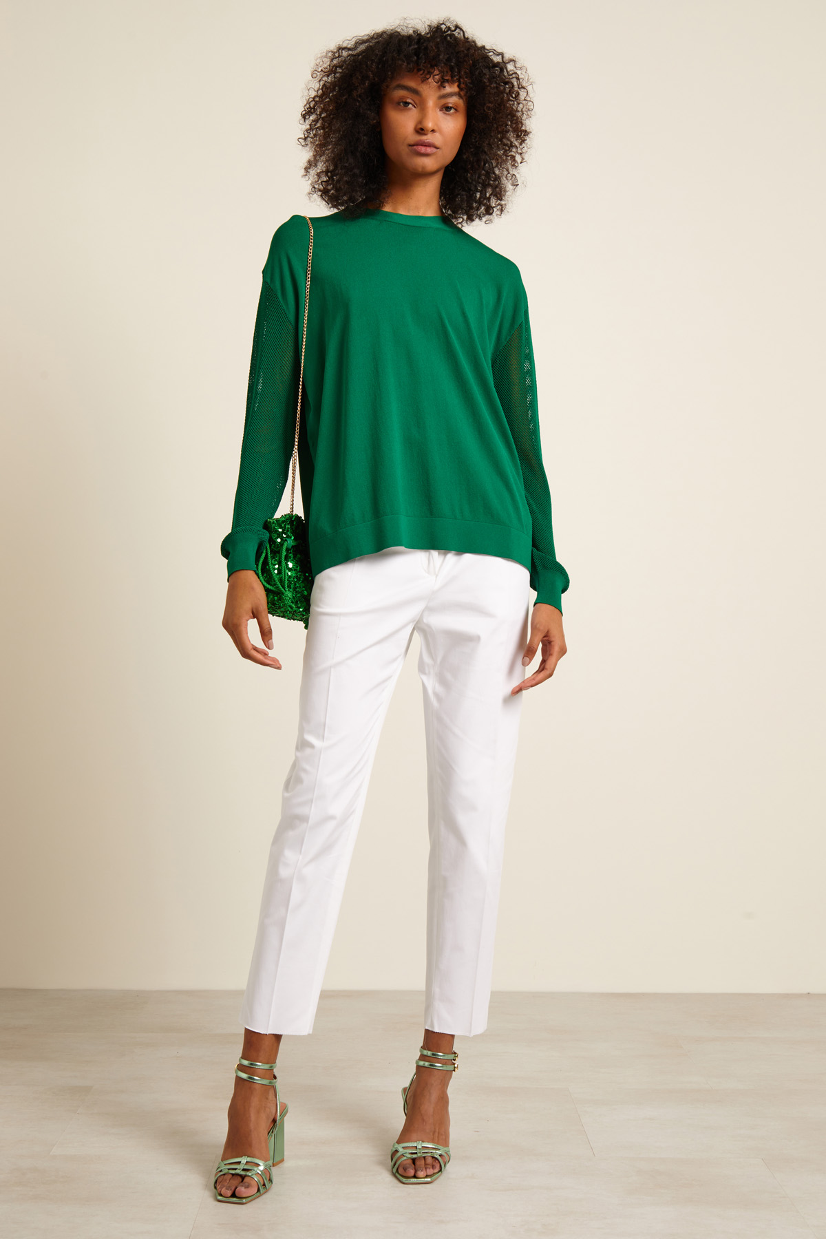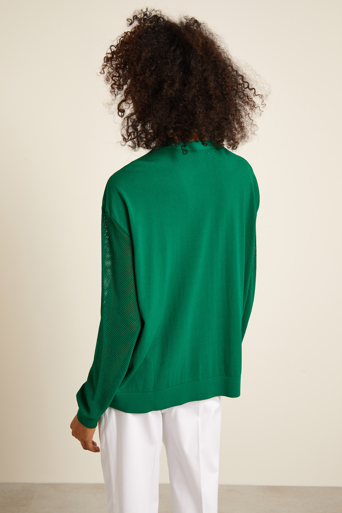 Maglia dalla linea morbida realizzata in filato di misto viscosa, con scollo a giro e maniche lunghe dal giro sceso con motivo a rete, profili rifiniti a coste.