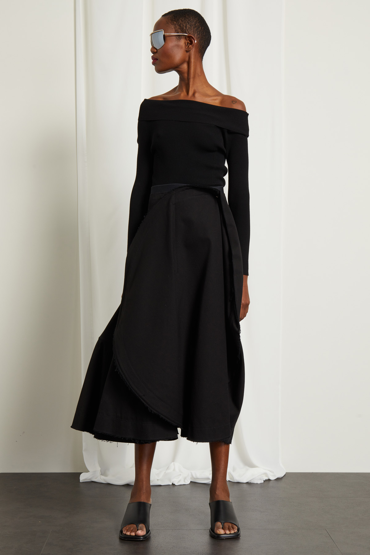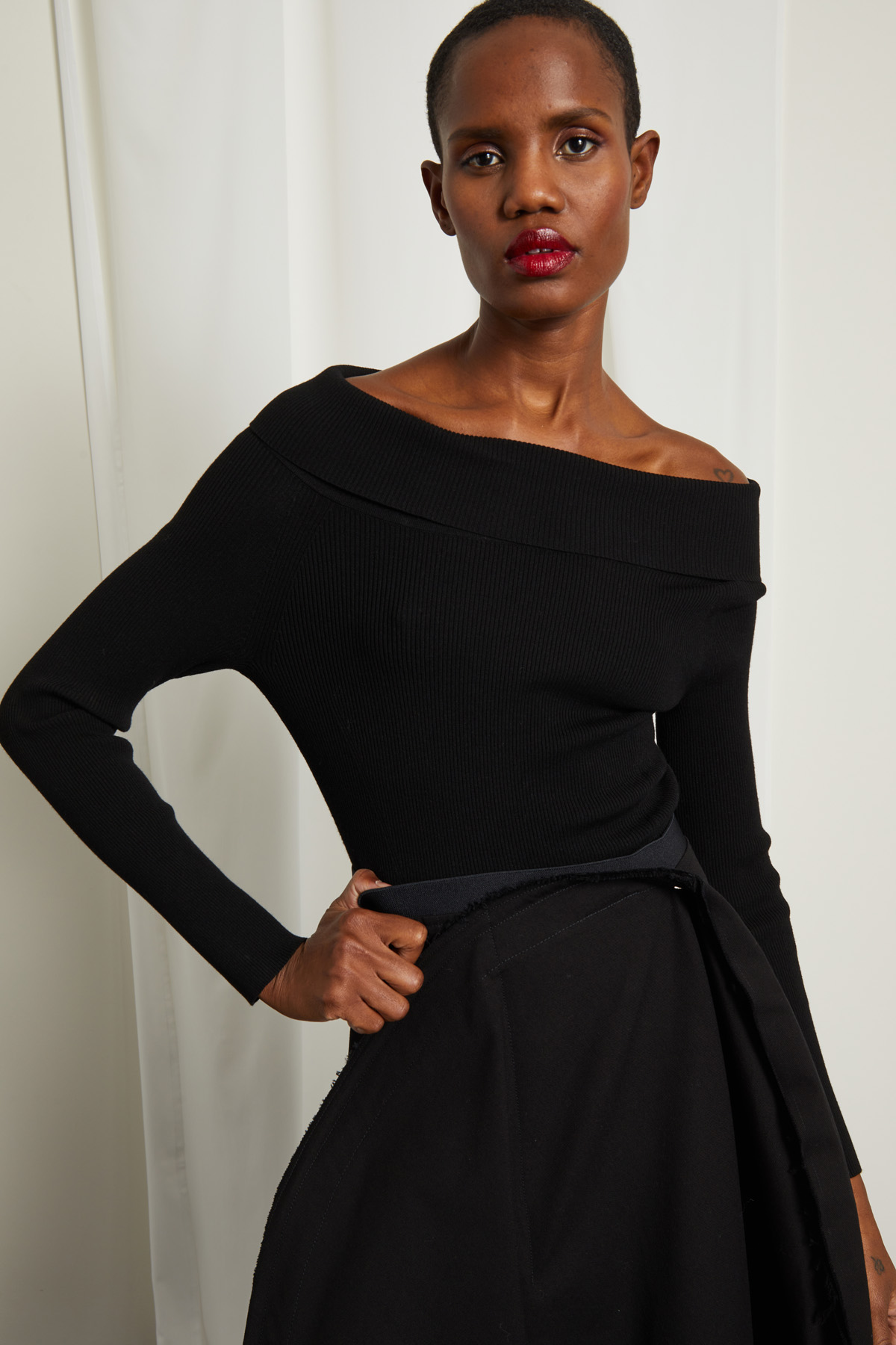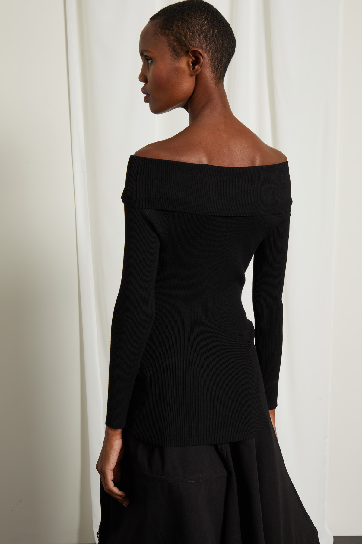 Maglia dalla linea aderente realizzata in filato di misto viscosa a coste, con scollo ampio risvoltato e maniche lunghe raglan.