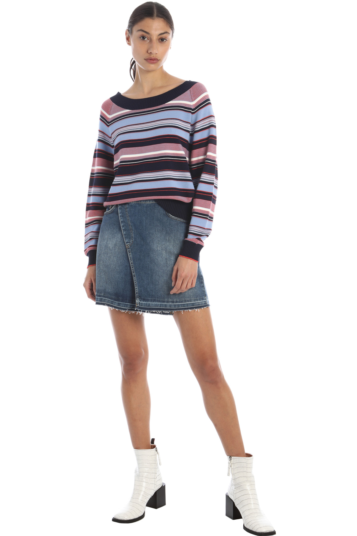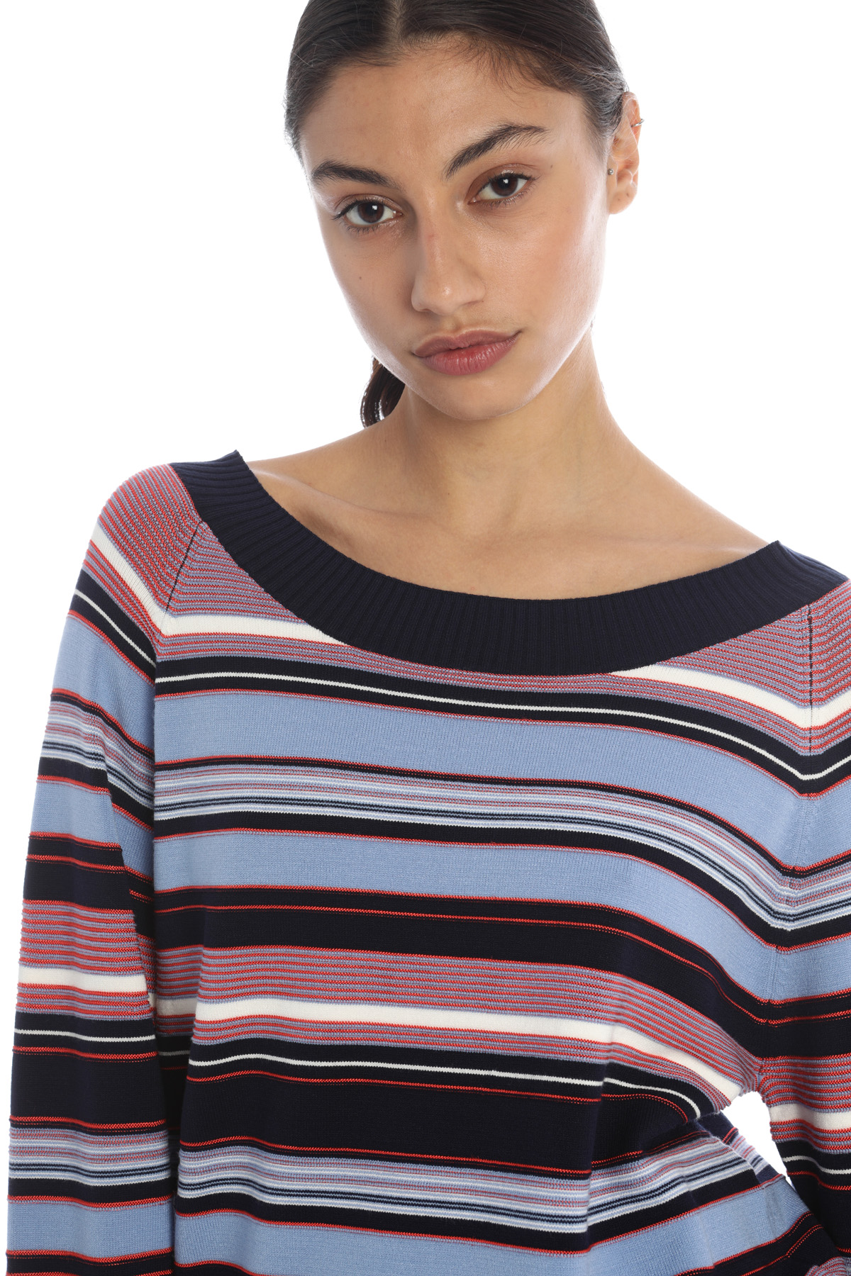 Maglia dalla linea morbida realizzata in filato di misto viscosa, con lavorazione tinto filo, ampio scollo rotondo, maniche lunghe raglan e bordi rifiniti a costine.