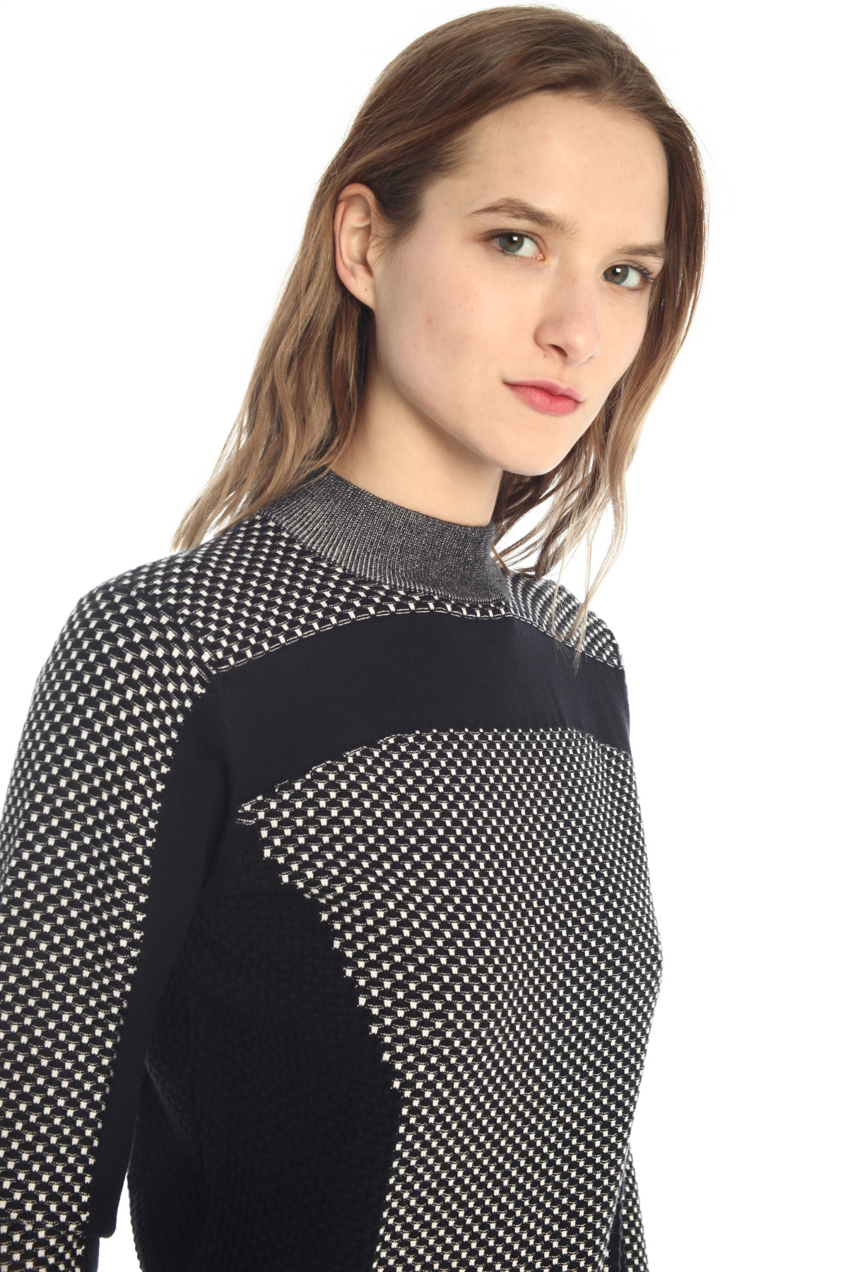 Maglia dalla linea semiaderente realizzata in filato di misto viscosa, con lavorazioni color block, in rilievo e tinto filo. Collo montante, maniche lunghe e bordi rifiniti a coste.