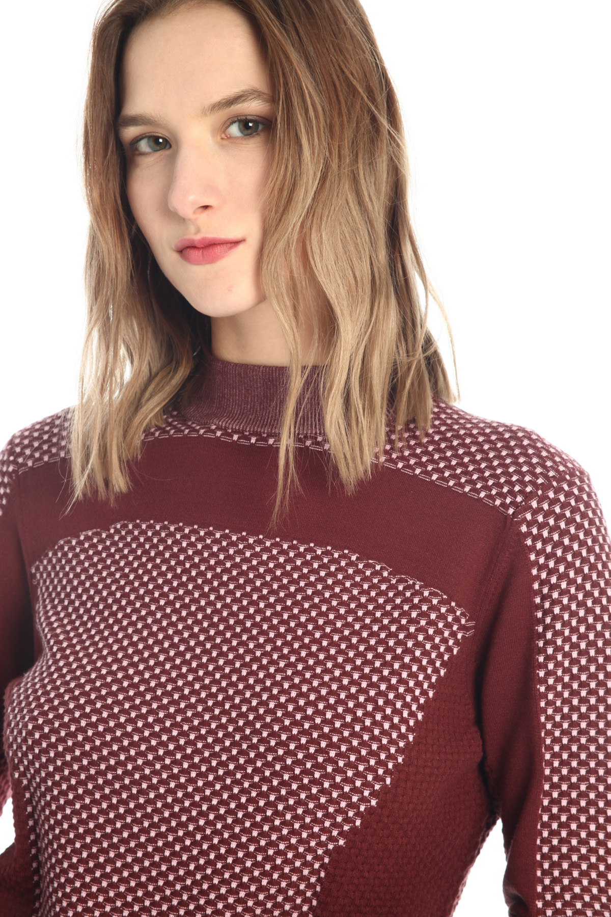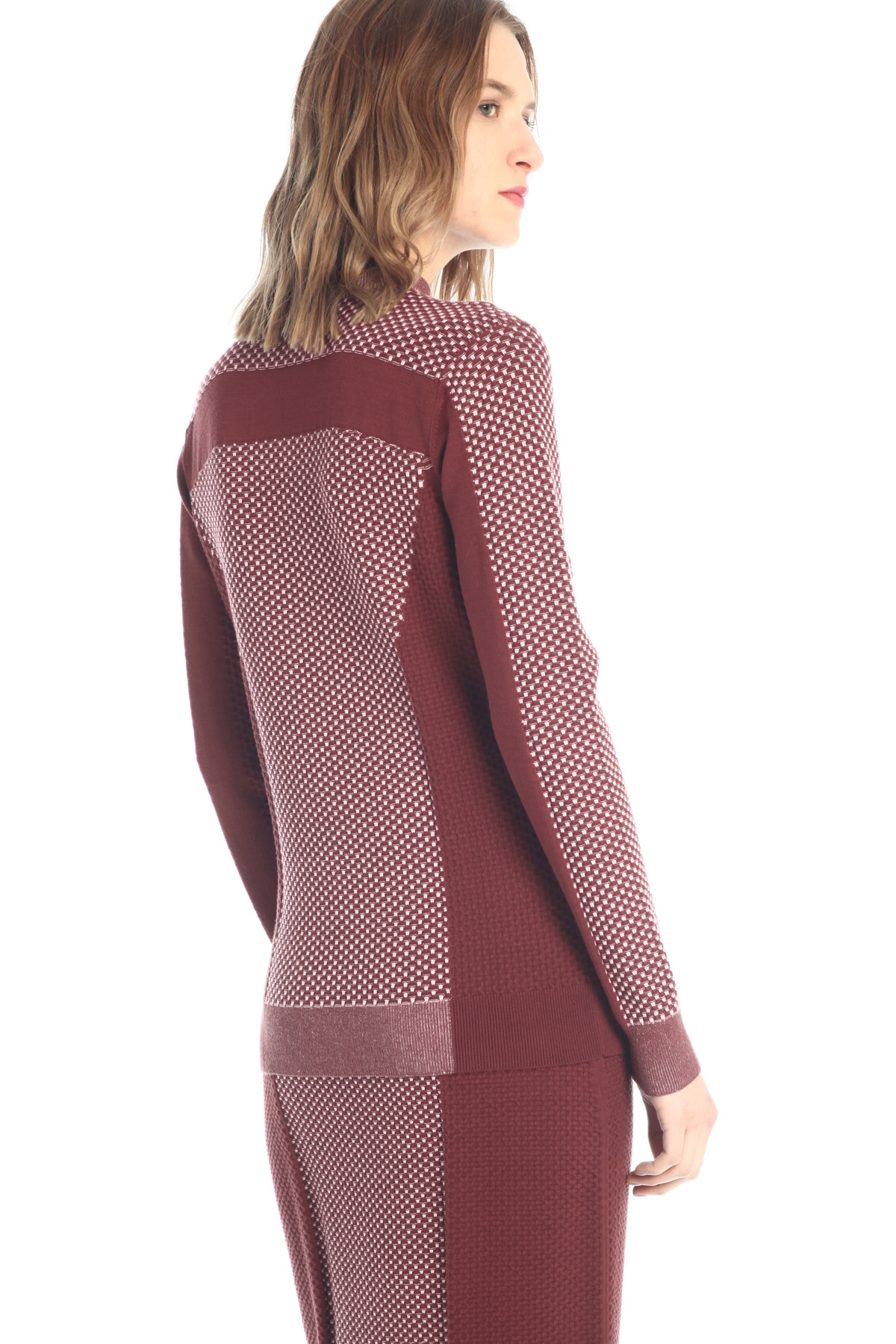Maglia dalla linea semiaderente realizzata in filato di misto viscosa, con lavorazioni color block, in rilievo e tinto filo. Collo montante, maniche lunghe e bordi rifiniti a coste.