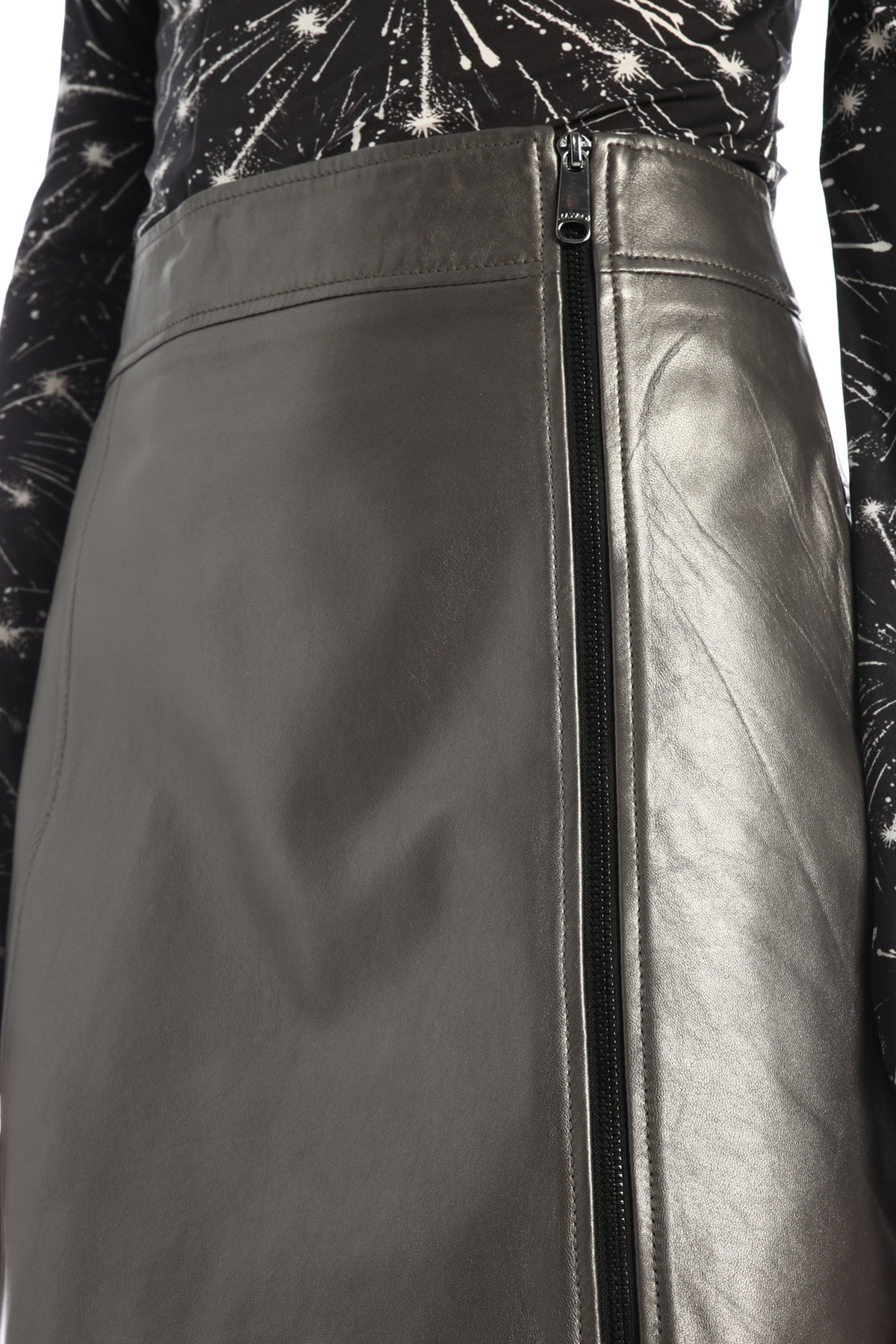 Minigonna dalla linea leggermente ad A realizzata in vera pelle spalmata, con allacciatura tramite zip e fodera interna.