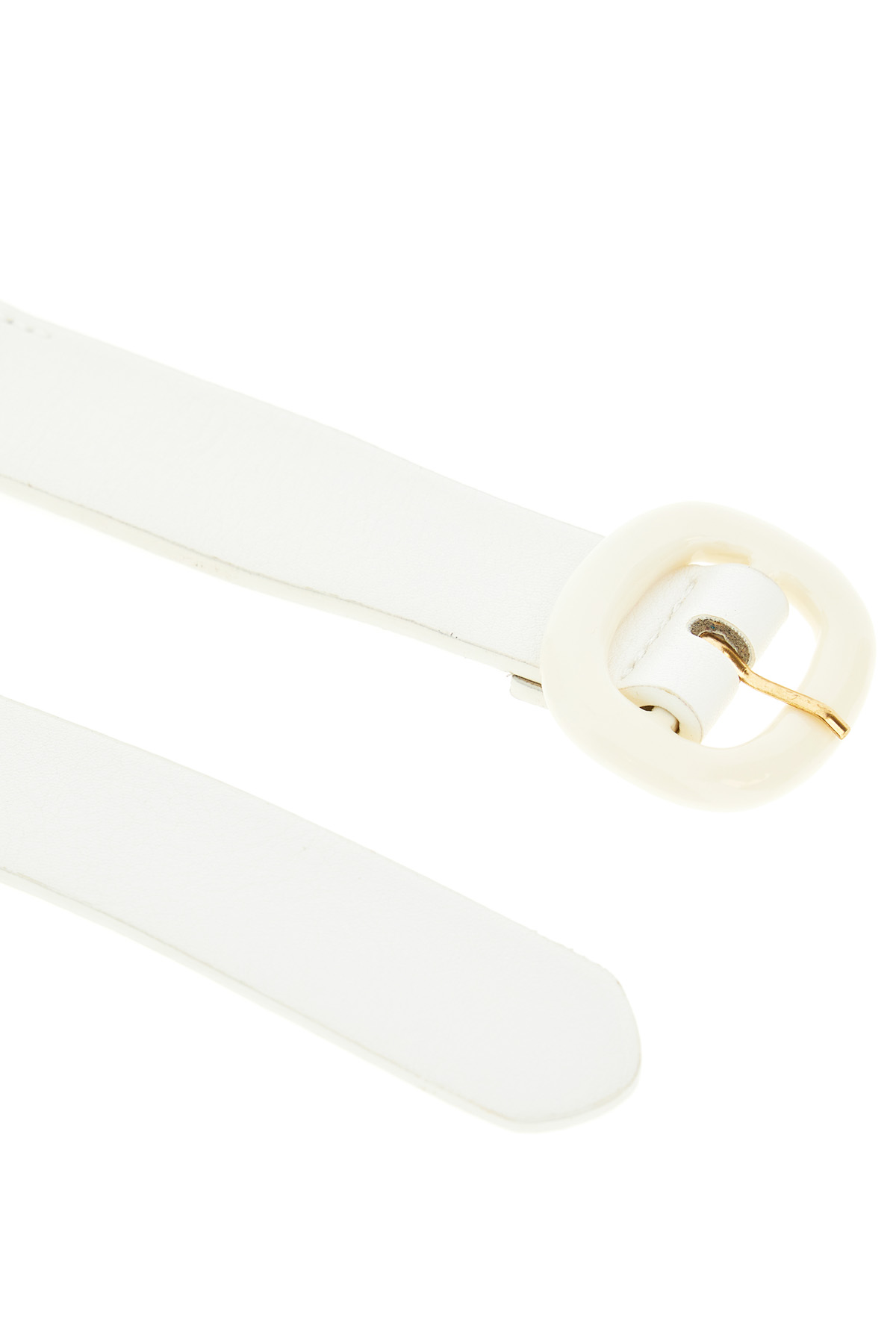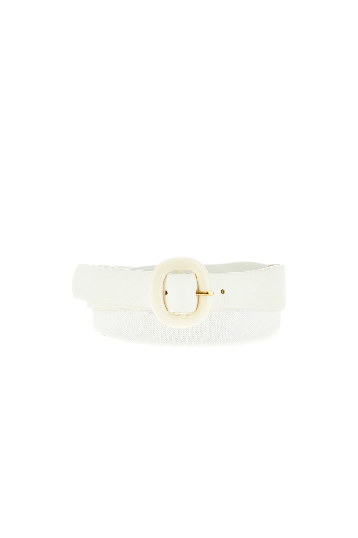 Cintura realizzata in similpelle con inserto elastico, fibbia in resina e dettagli in metallo.