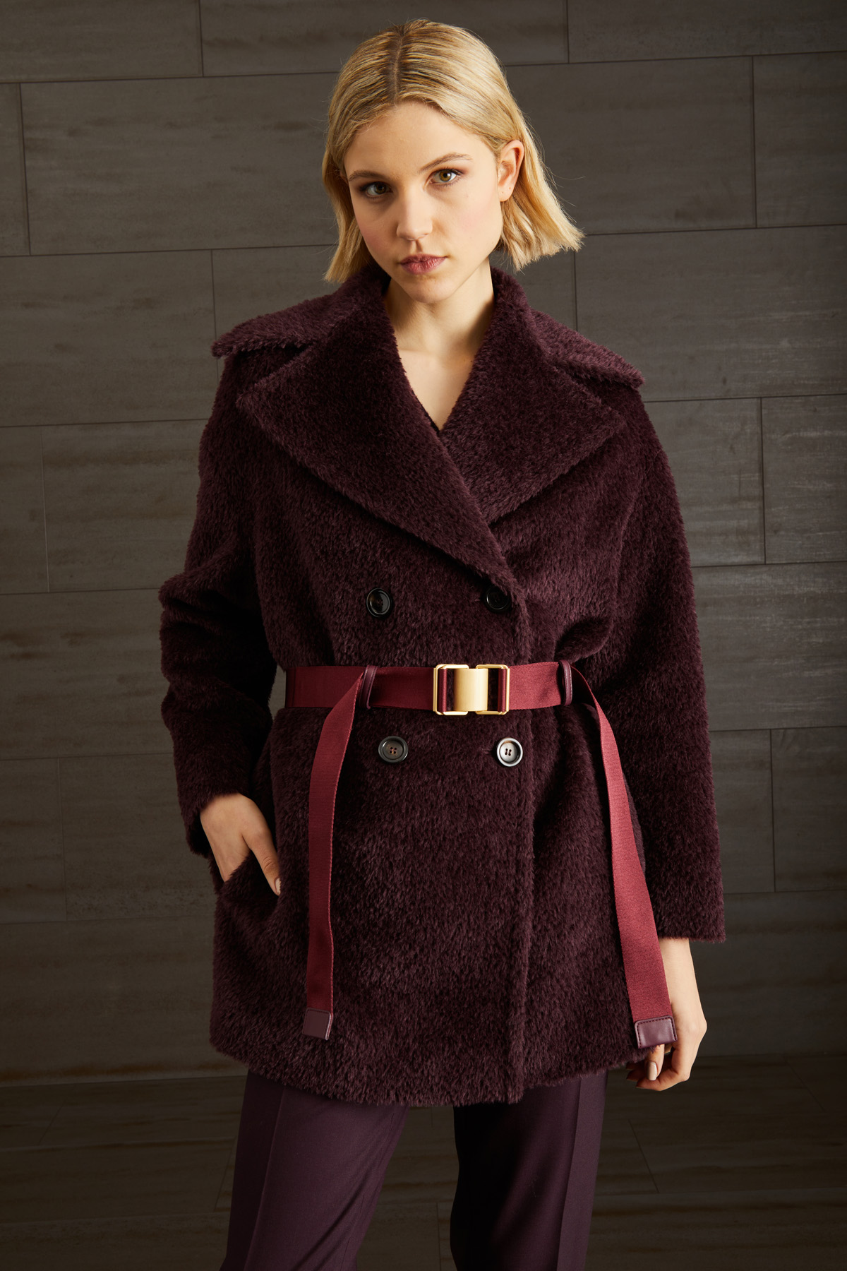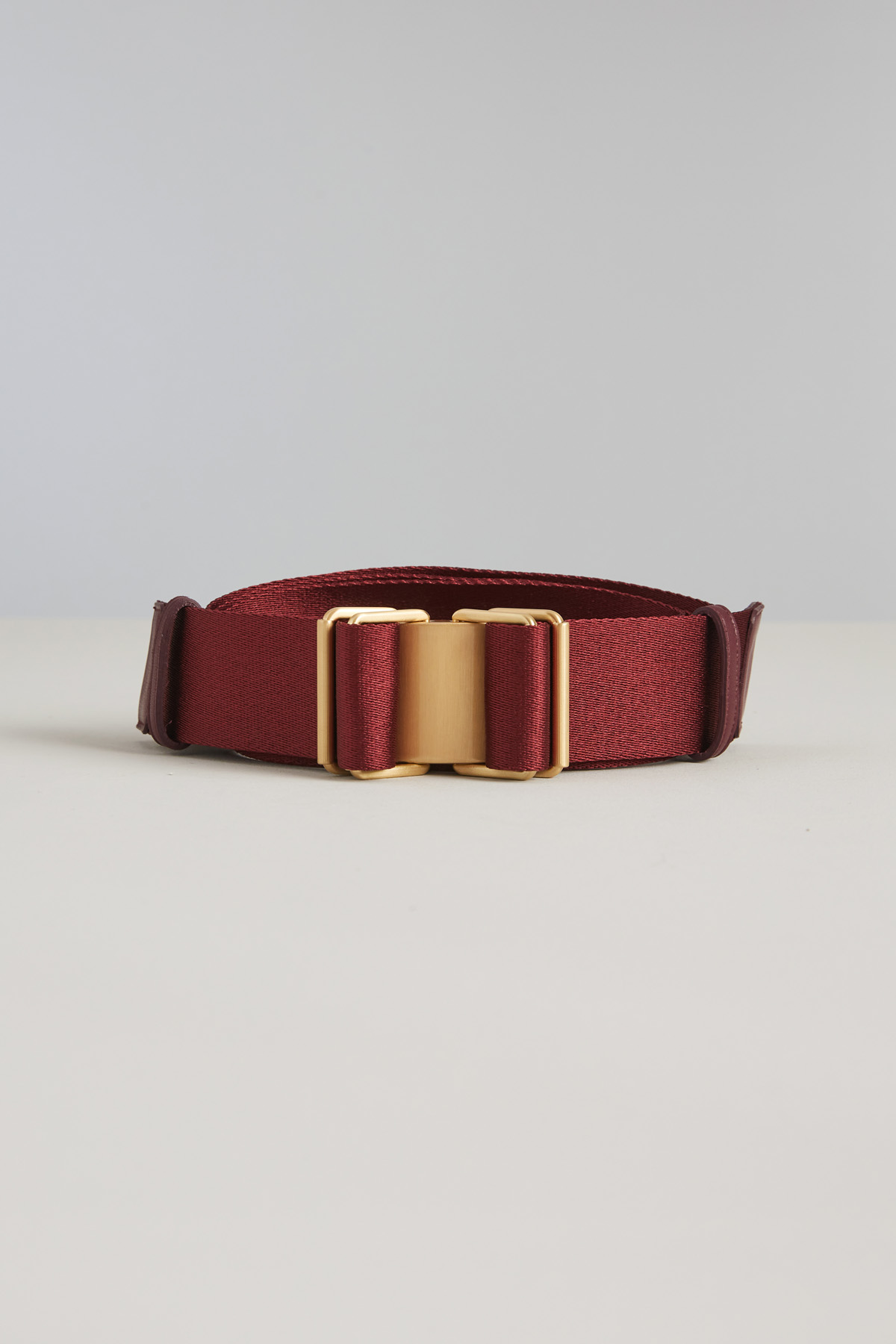 Cintura a nastro realizzata in gros grain con detaggli in similpelle e chiusura tramite fibbia in metallo.