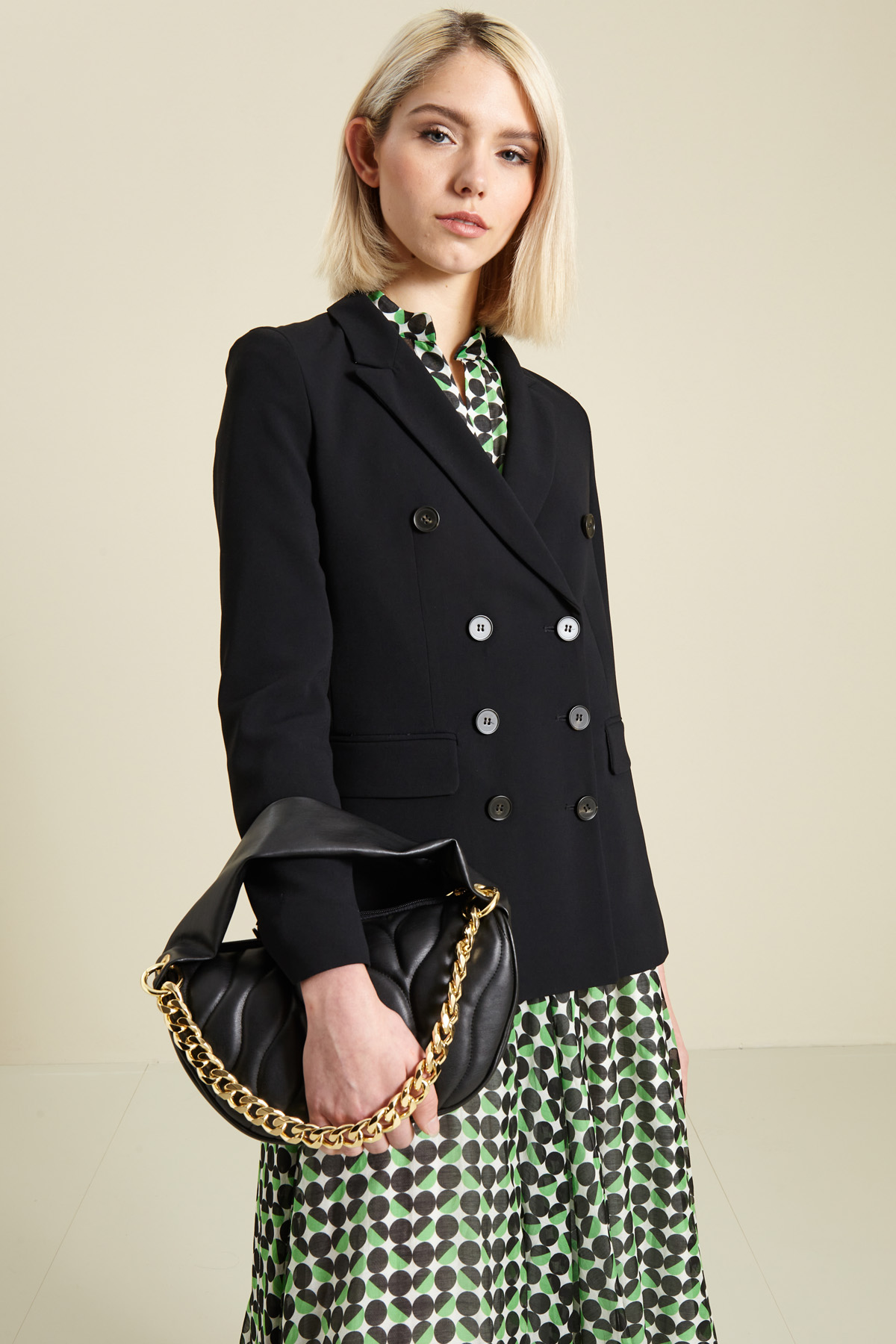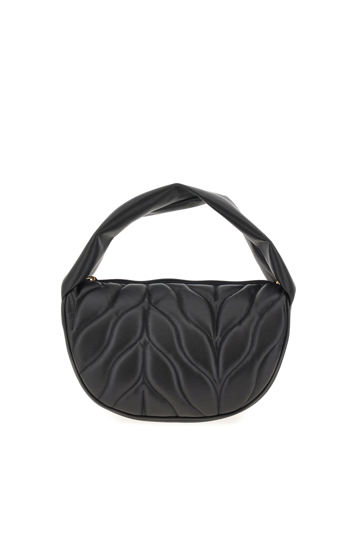 Borsa a mano dalla linea a mezza luna realizzata in tessuto spalmato effetto pelle, con doppio manico in similpelle e a catena rimovibile, interno foderato con taschino e chiusura tramite zip.