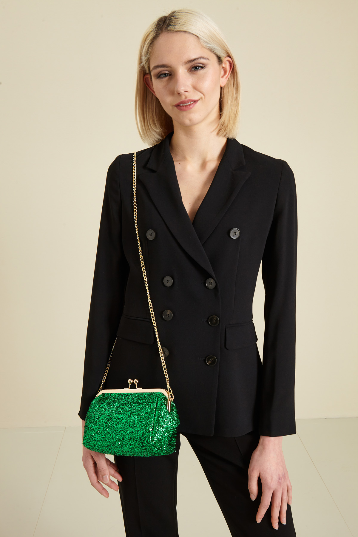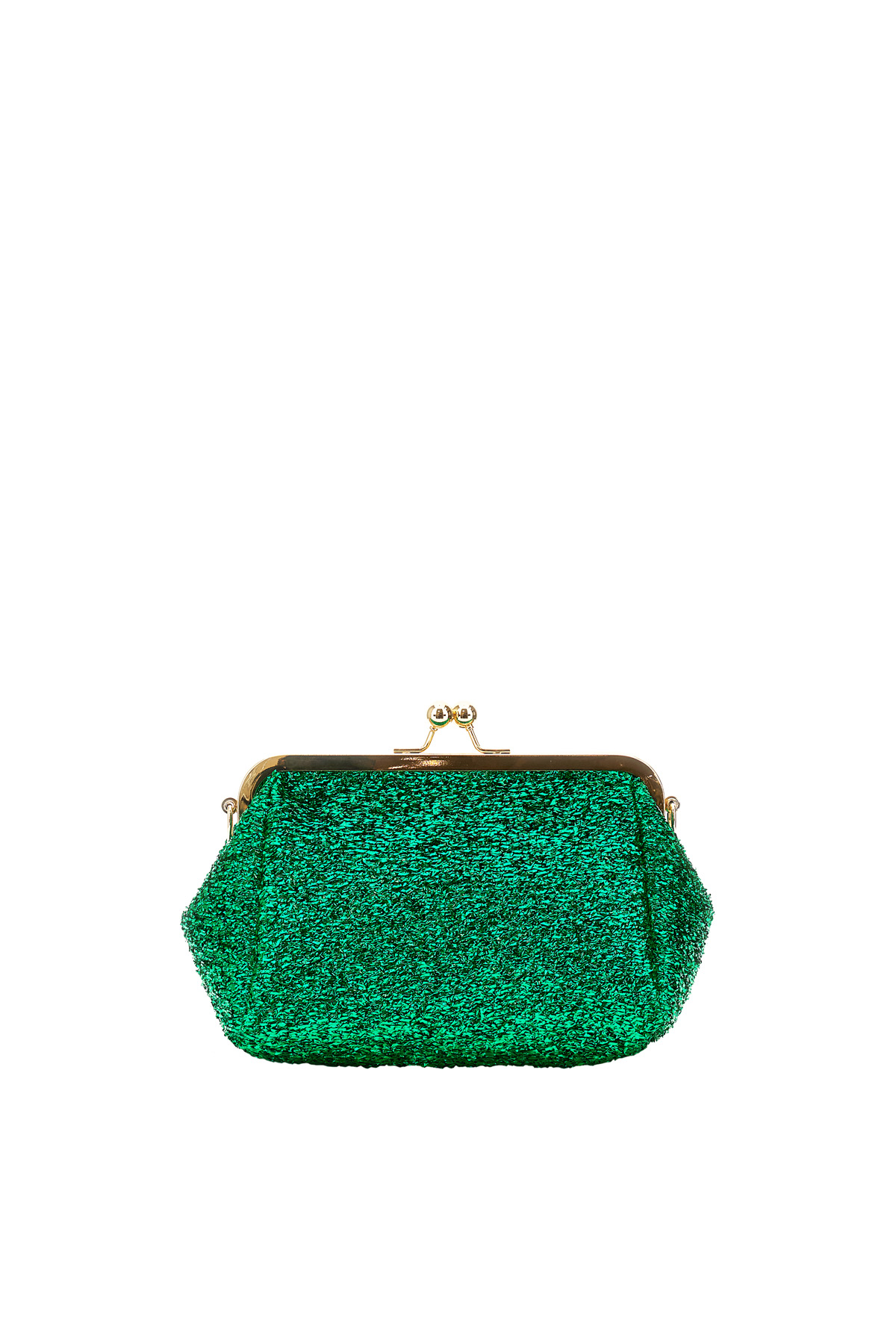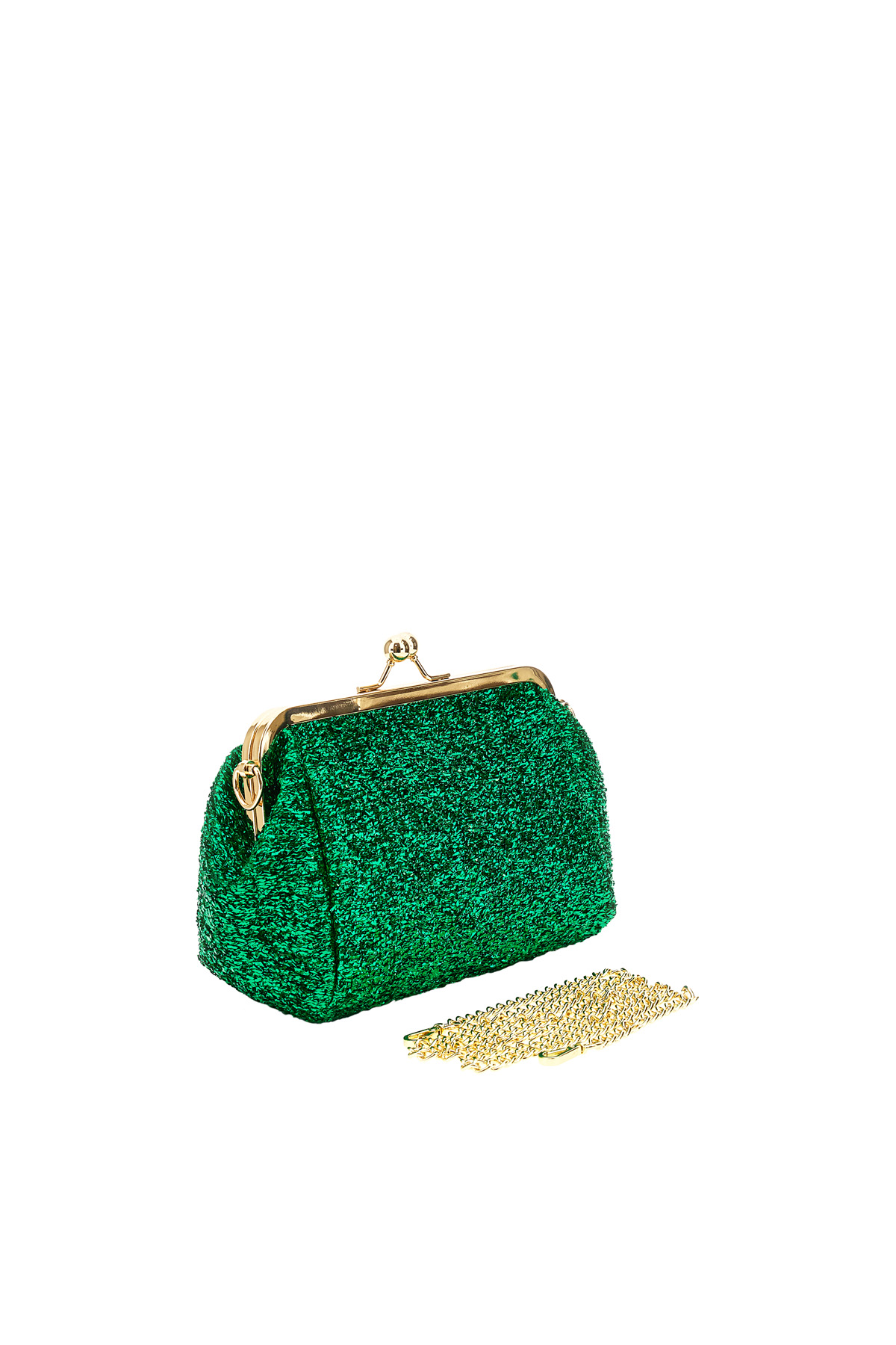 Clutch realizzata in tela di fibra metallizzata, con tracolla a catena e manico rimovibili, interno foderato in twill e chiusura a scatto tramite sfere.