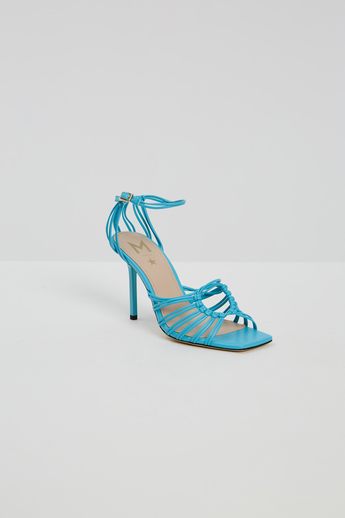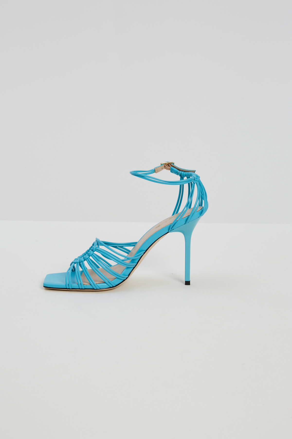 Sandali a listini realizzati in similpelle con cinturino alla caviglia, tacco sottile laccato in tinta e suola in cuoio.