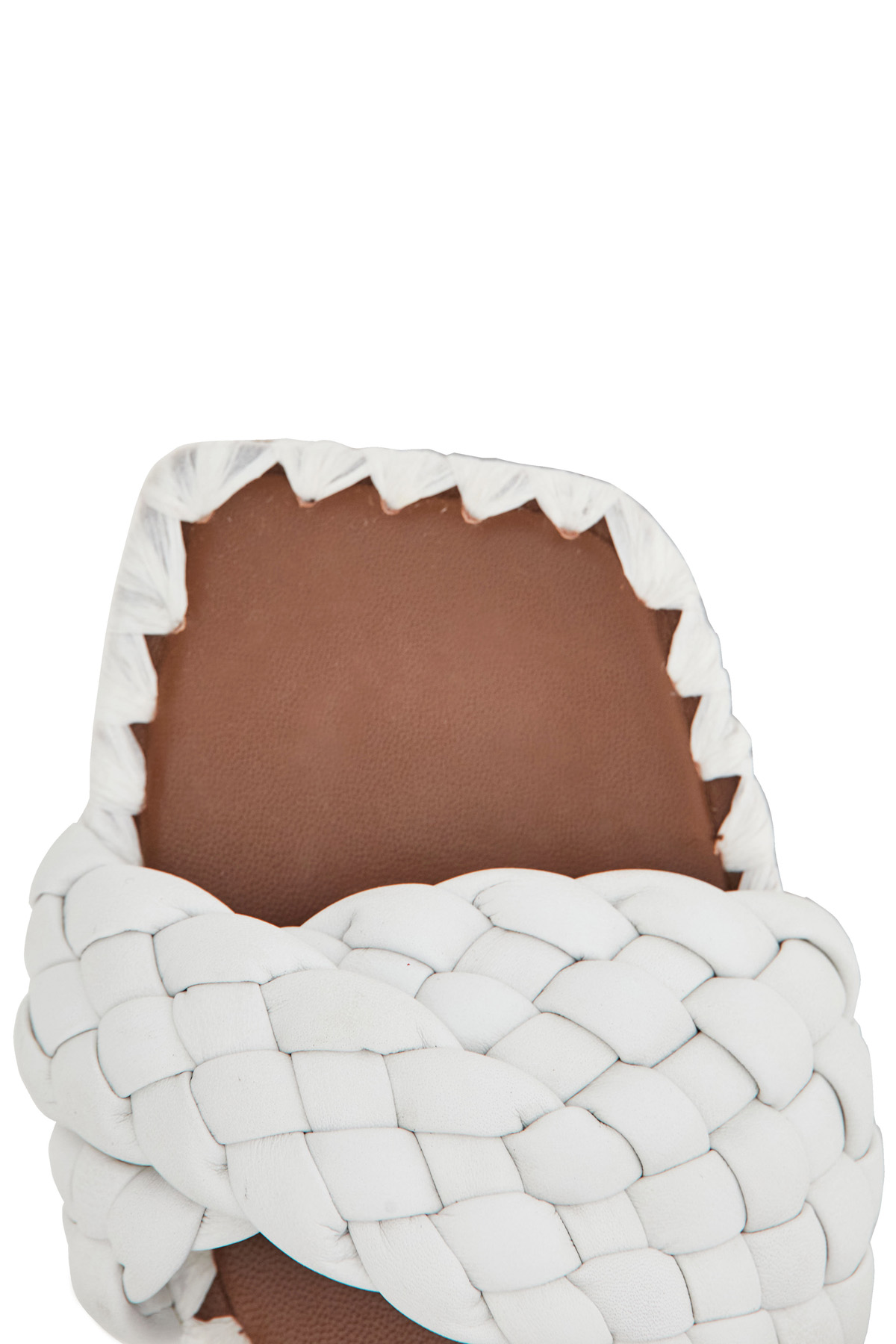 Ciabatte a fascia singola con lavorazione intrecciata e imbottita realizzate in pelle. Suola in gomma.
