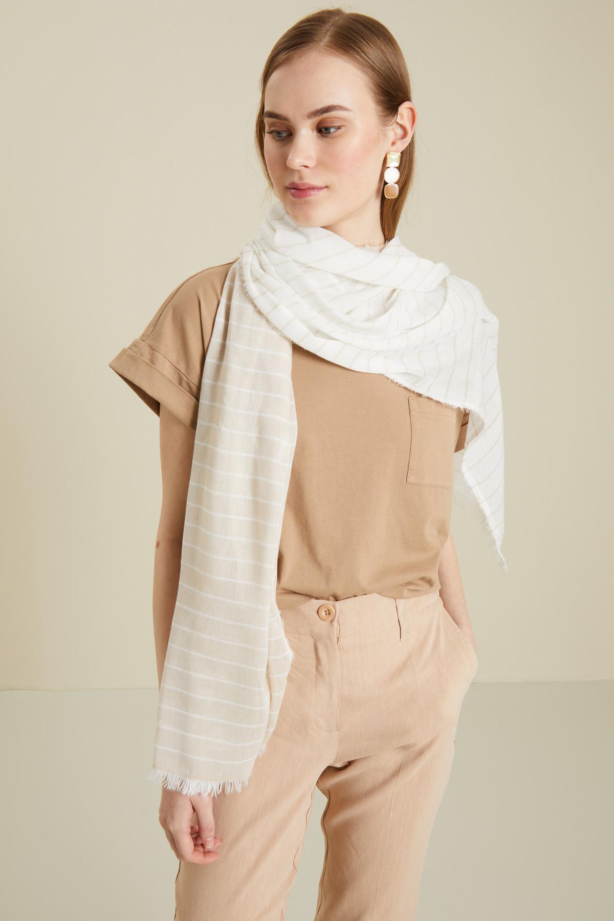 Sciarpa realizzata in tela leggera di misto viscosa tinto filo con profili sfrangiati.