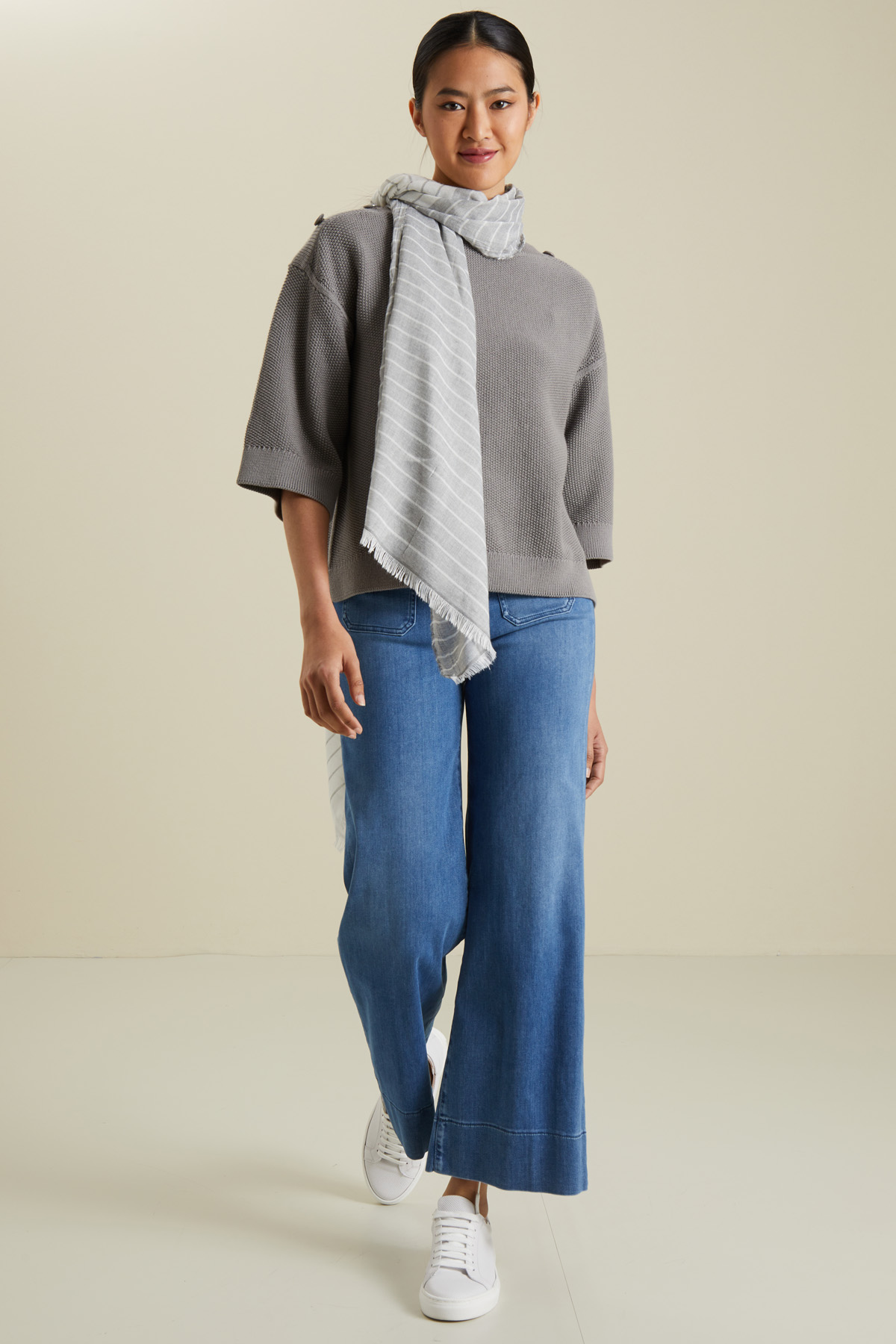 Sciarpa realizzata in tela leggera di misto viscosa tinto filo con profili sfrangiati.