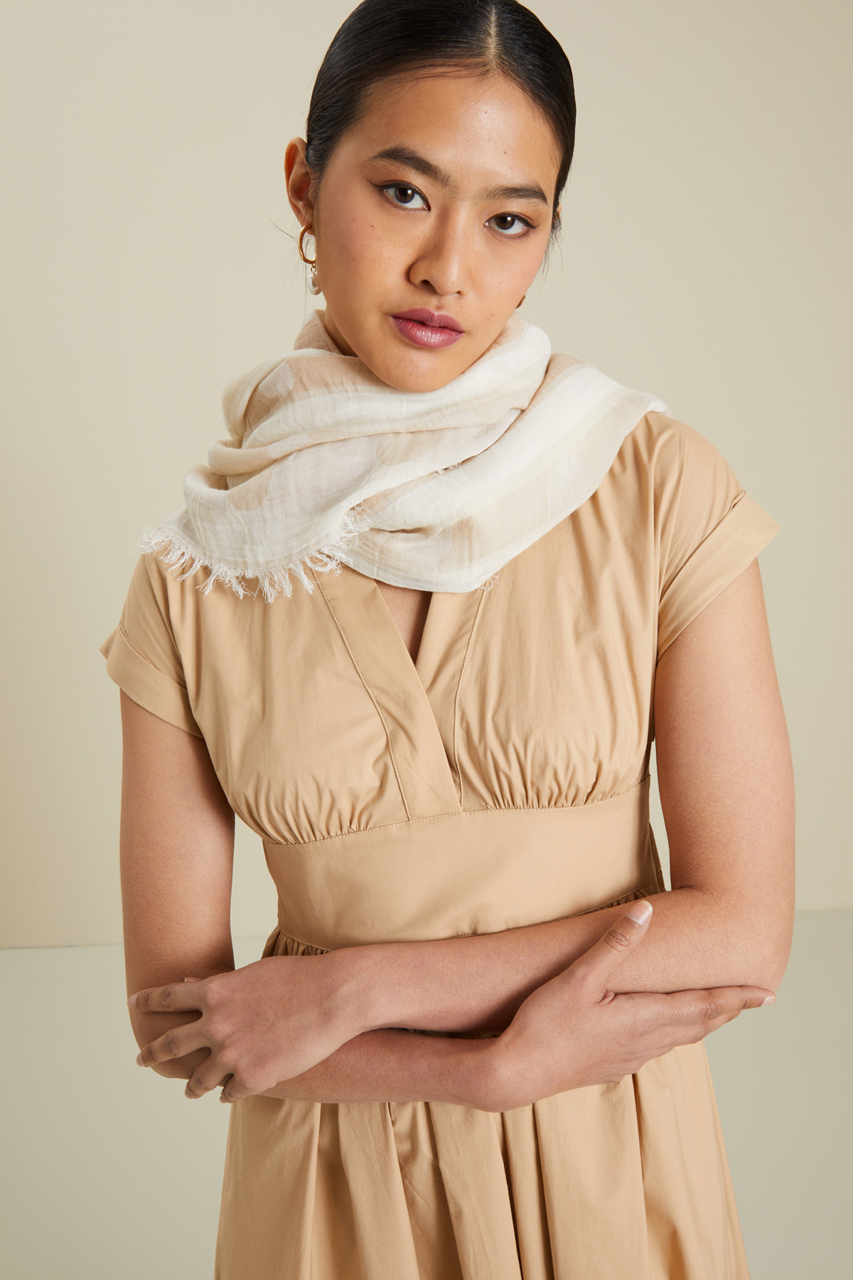 Sciarpa realizzata in tela di misto fibra naturale stampata, con profili sfrangiati.