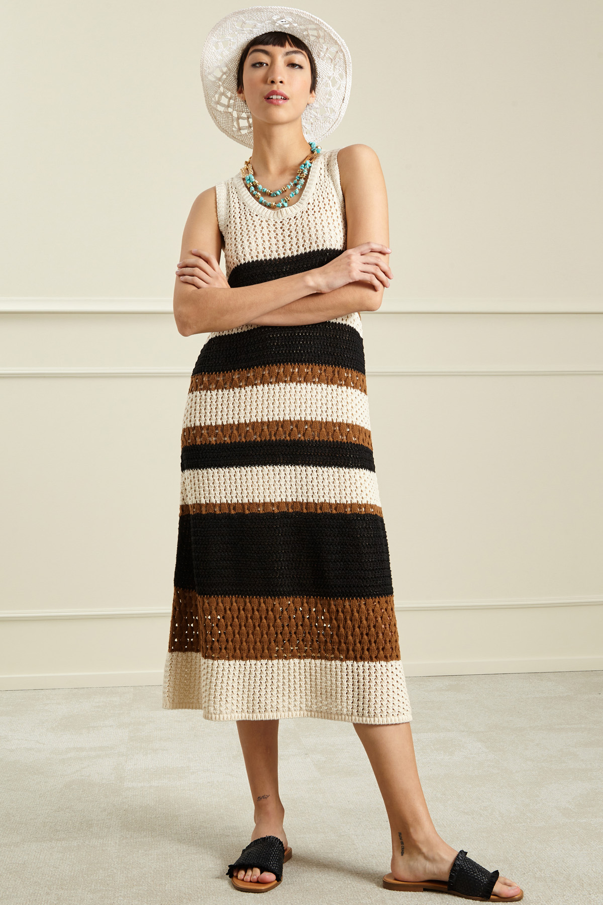 Cappello realizzato in rafia, con lavorazione traforata e dettaglio di cordino multifilo rifinito da perline in resina.