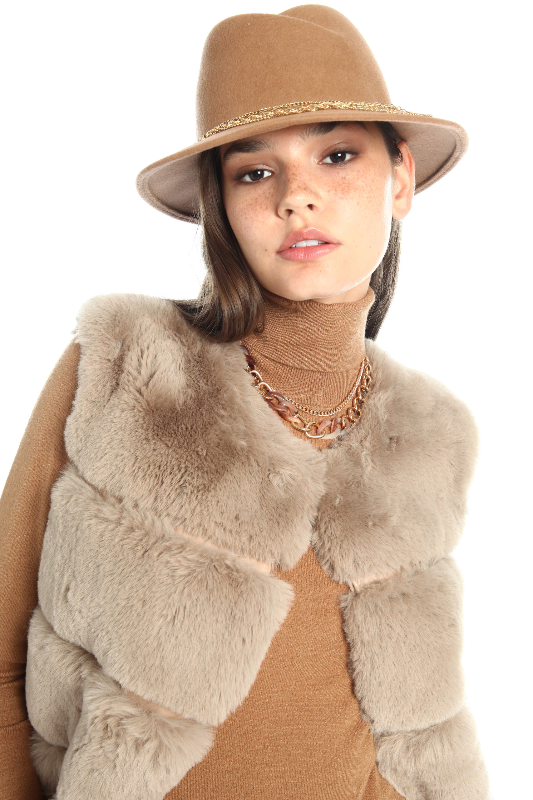Cappello modello fedora realizzato in pura lana cotta, con dettaglio di micro catene.