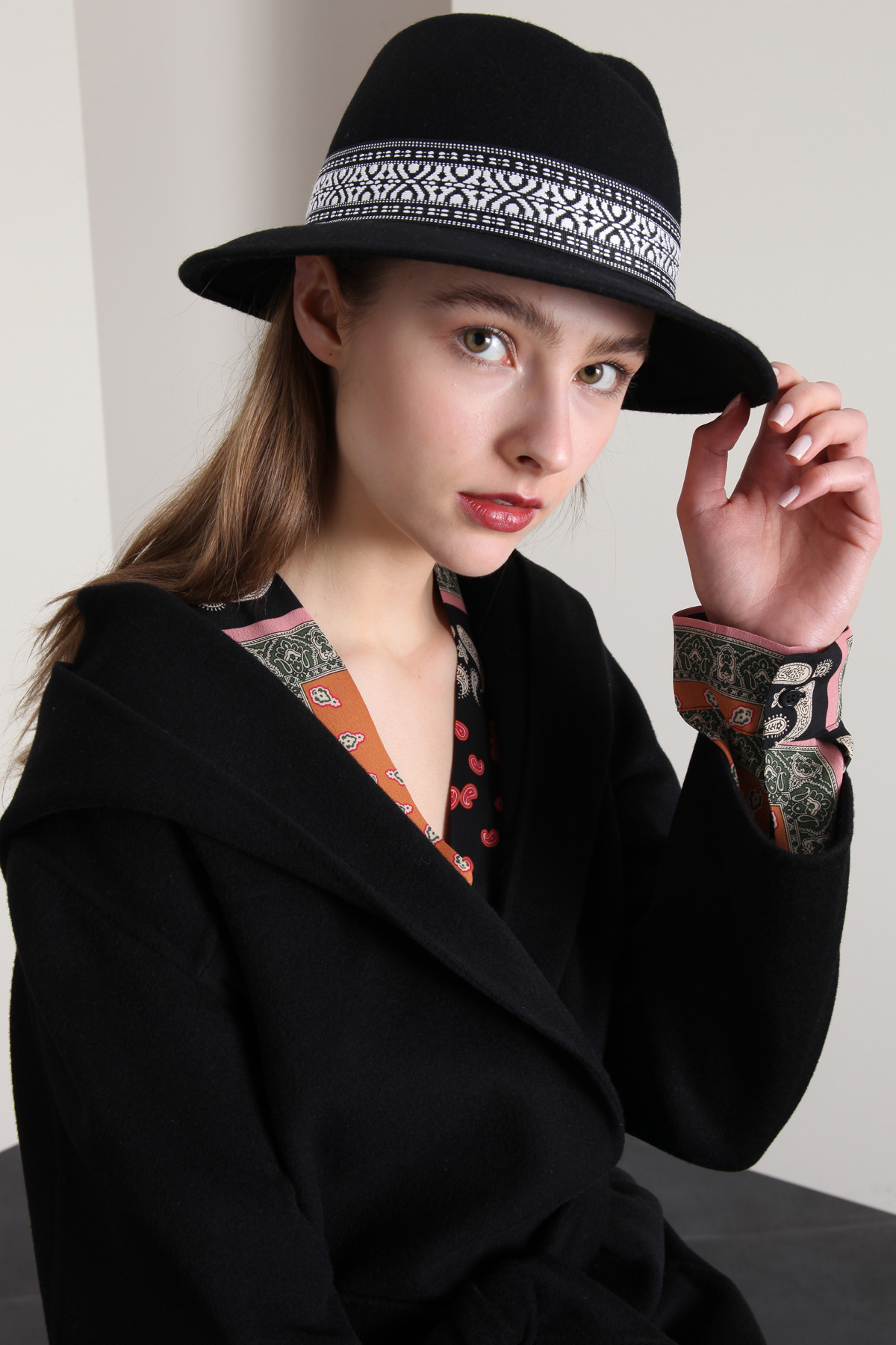 Cappello stile fedora realizzato in feltro di pura lana, con dettaglio in nastro a fantasia.