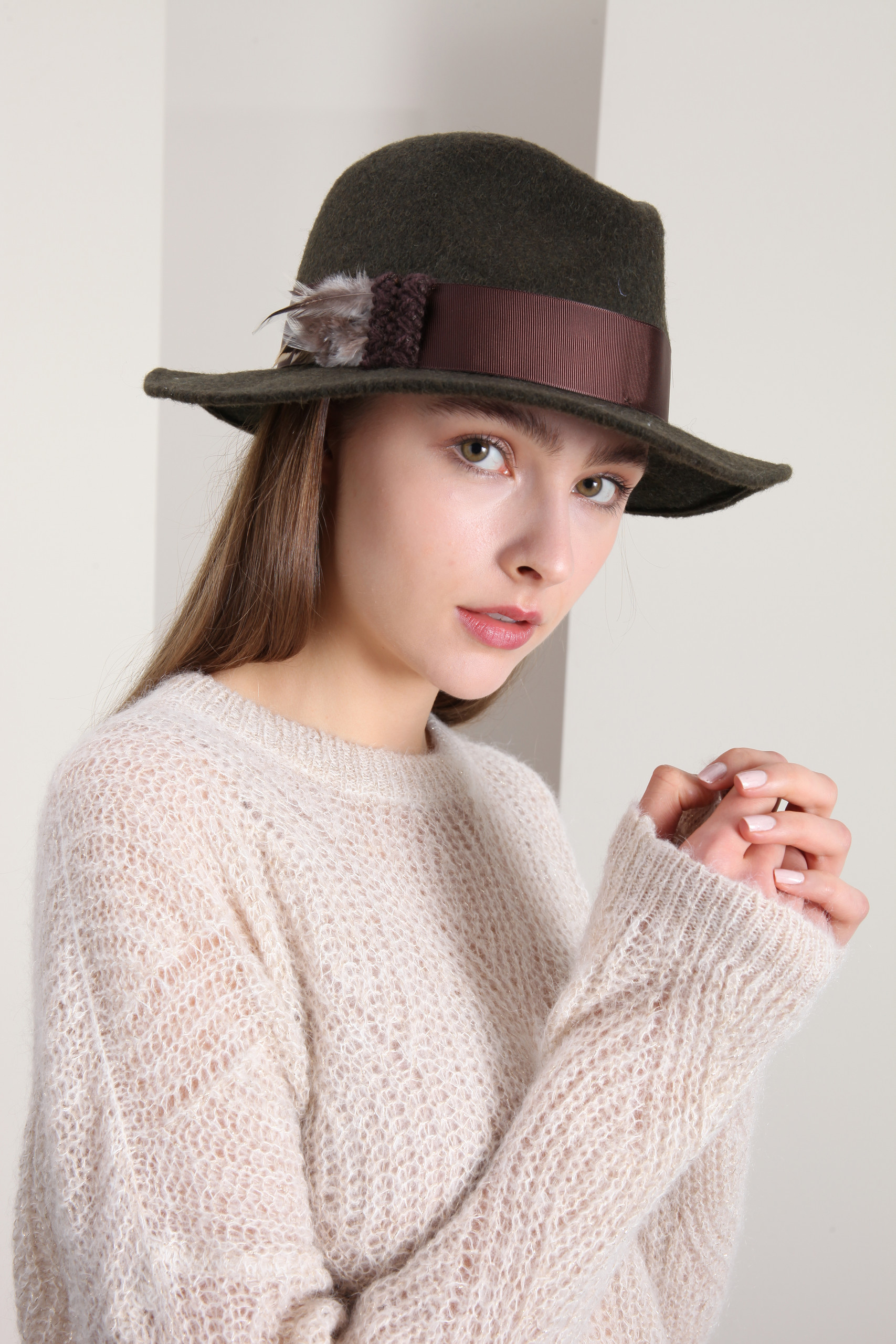 Cappello fedora realizzato in panno di misto lana, con nastro in gos grain e piume in tono.