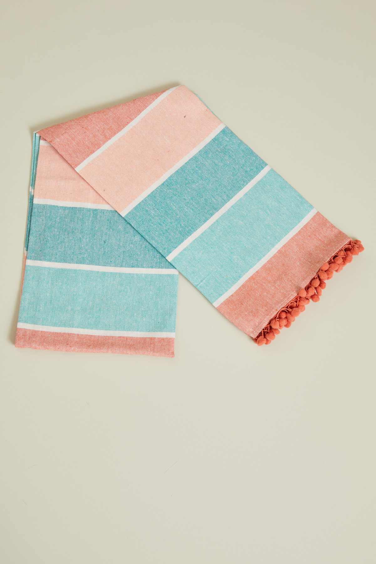 Telo mare realizzato in tela spessa di misto cotone tinto filo, con motivo di pon pon ai bordi. Lunghezza: 190 cm, Altezza: 90 cm.