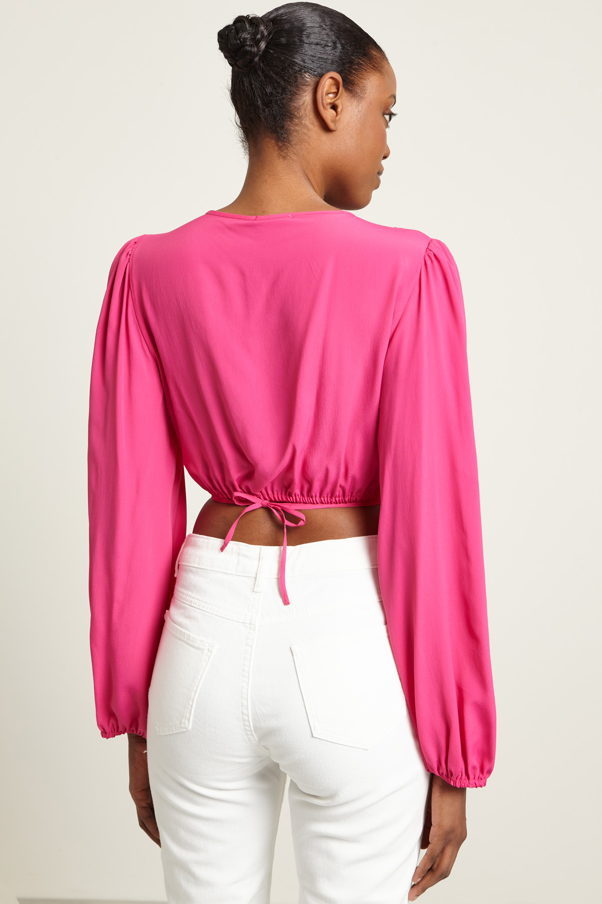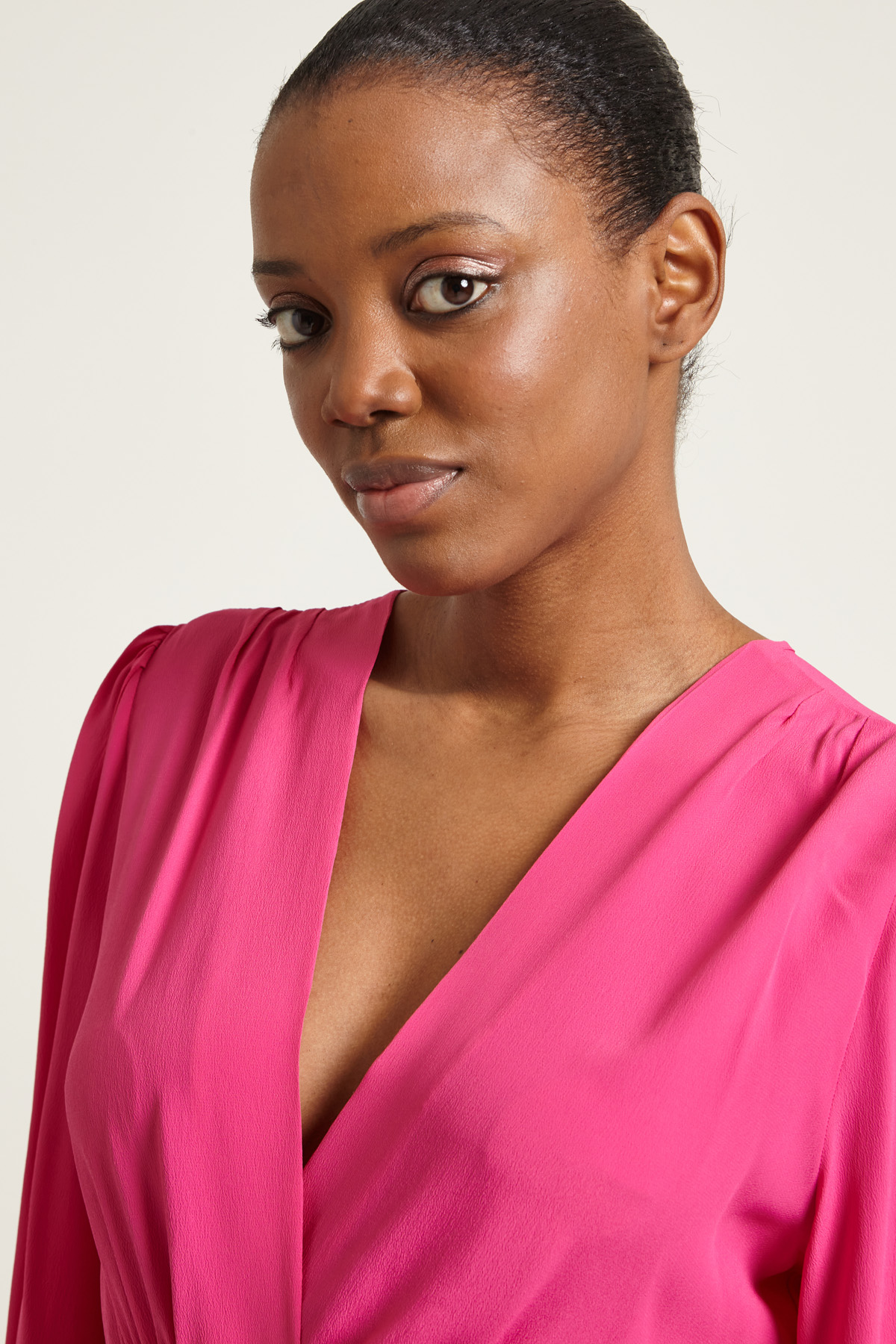 Coprispalle dalla linea regolare realizzato in crépe de chine di misto seta, con scollo a V incrociato, maniche lunghe, inserto elastico al polso e in vita. Laccetti da annodare.