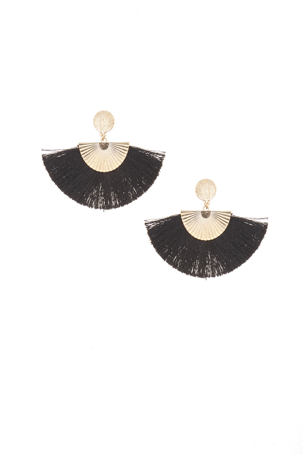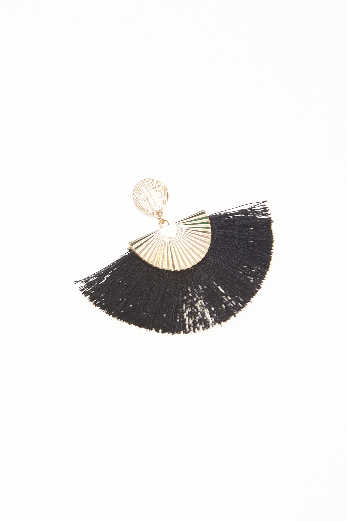 Orecchini a ventaglio realizzati in metallo con dettaglio di frange e chiusura a farfallina.