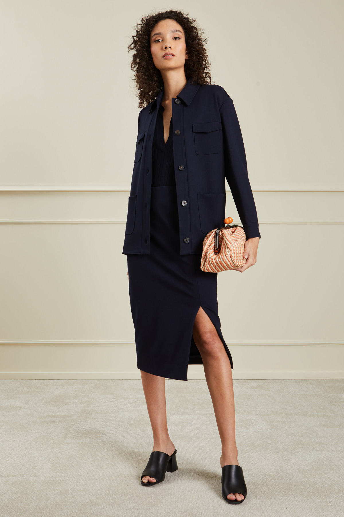 Gonna a tubo realizzata in jersey di misto viscosa stretch, con inserto elastico in vita e spacco al fondo.