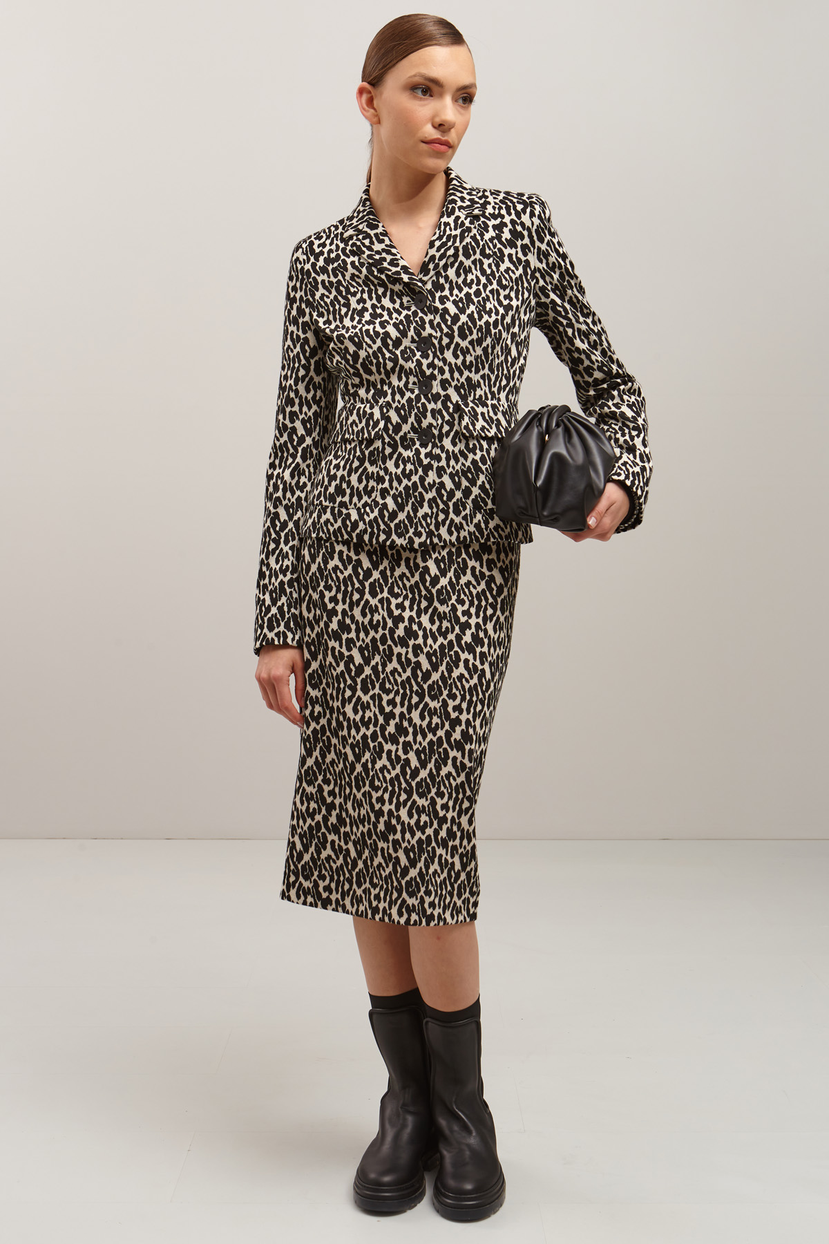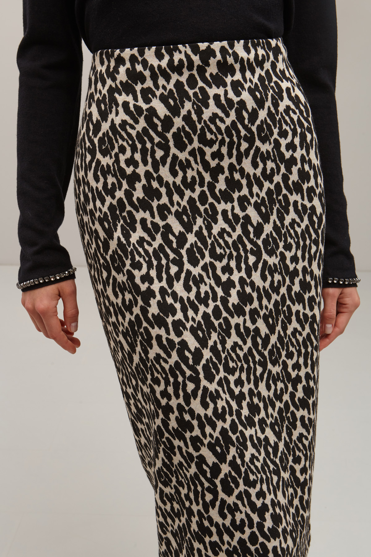 Gonna dalla linea aderente realizzata in jersey di misto viscosa jacquard, con spacco e allacciatura tramite zip invisibile e gancio nel retro. Foderata.