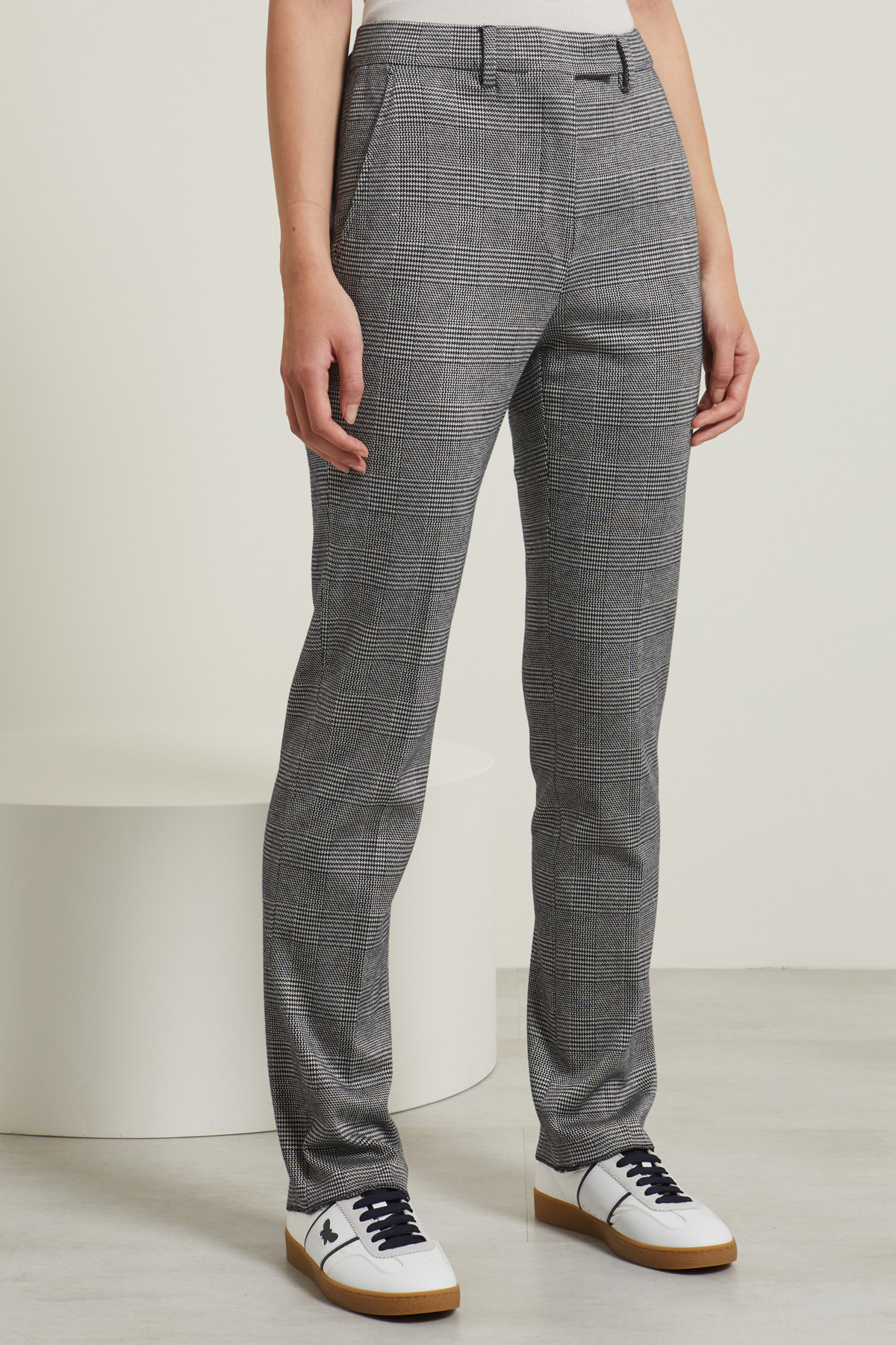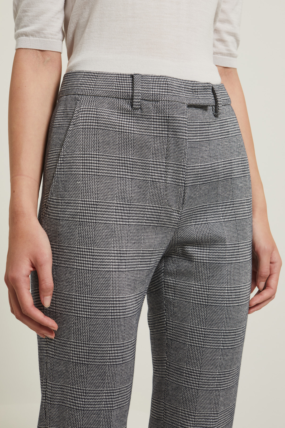 Pantaloni a sigaretta realizzati in jersey di misto viscosa e cotone stretch jacquard, con passanti in vita, tasche laterali alla francese. Allacciatura nascosta tramite zip, bottone e gancio.