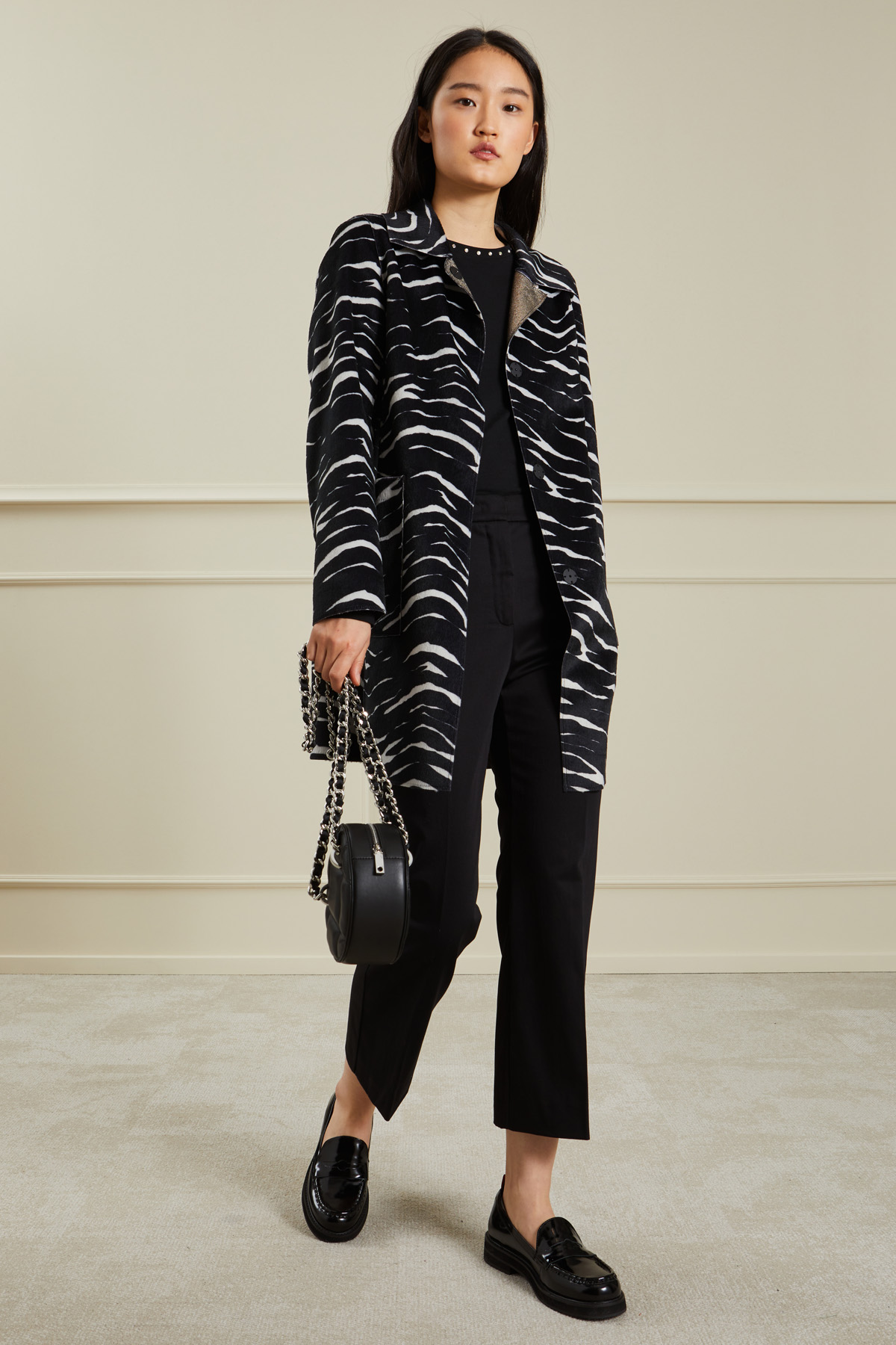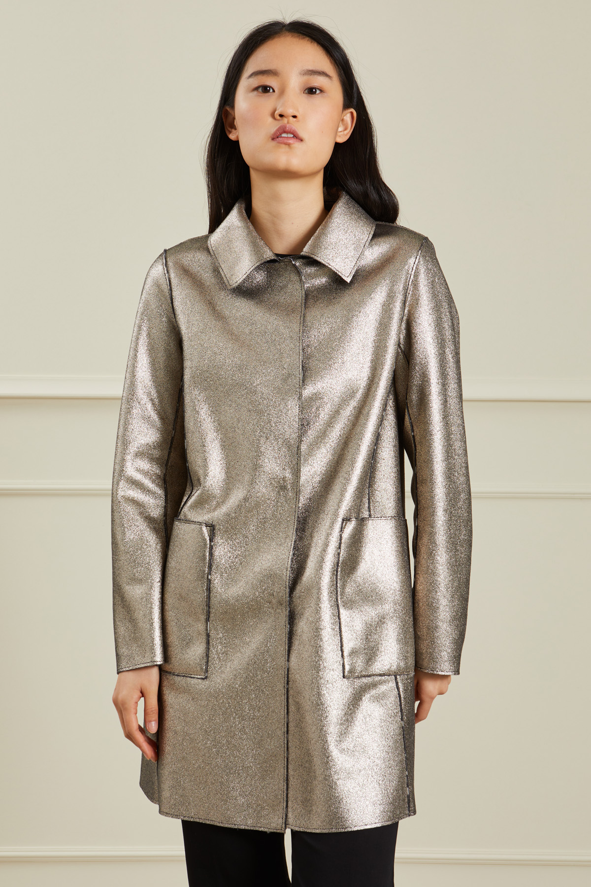 Giacca reversibile dalla linea dritta realizzata in tessuto effetto cavallino stampato, colletto a camicia, maniche lunghe, tasche applicate sul davanti e allacciatura monopetto nascosta tramite bottoni.