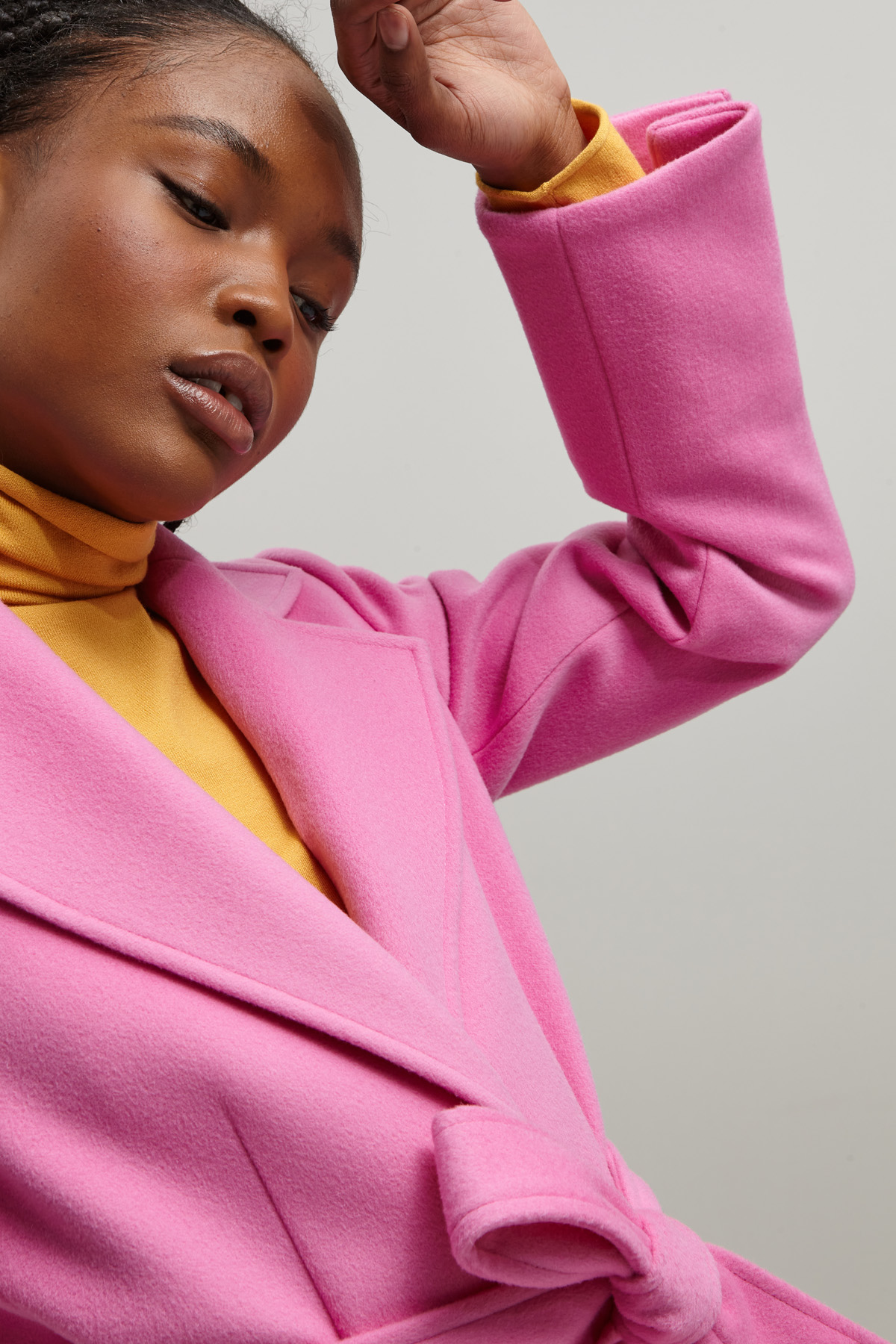 Cappotto dalla linea dritta realizzato in doppio drap di pura lana, con collo a rever, maniche lunghe con spacchetto al fondo, tasche applicate e spacco nel retro. Allacciatura tramite cintura coordinata. Capo foderato.