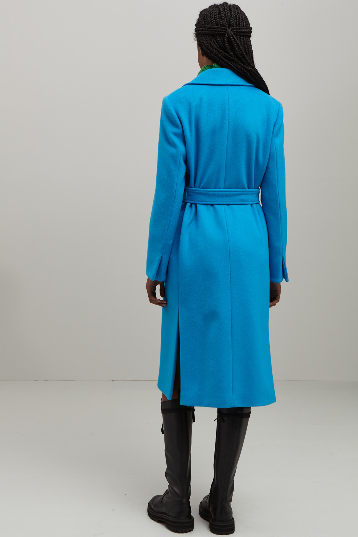 Cappotto dalla linea dritta realizzato in doppio drap di pura lana, con collo a rever, maniche lunghe con spacchetto al fondo, tasche applicate e spacco nel retro. Allacciatura tramite cintura coordinata. Capo foderato.