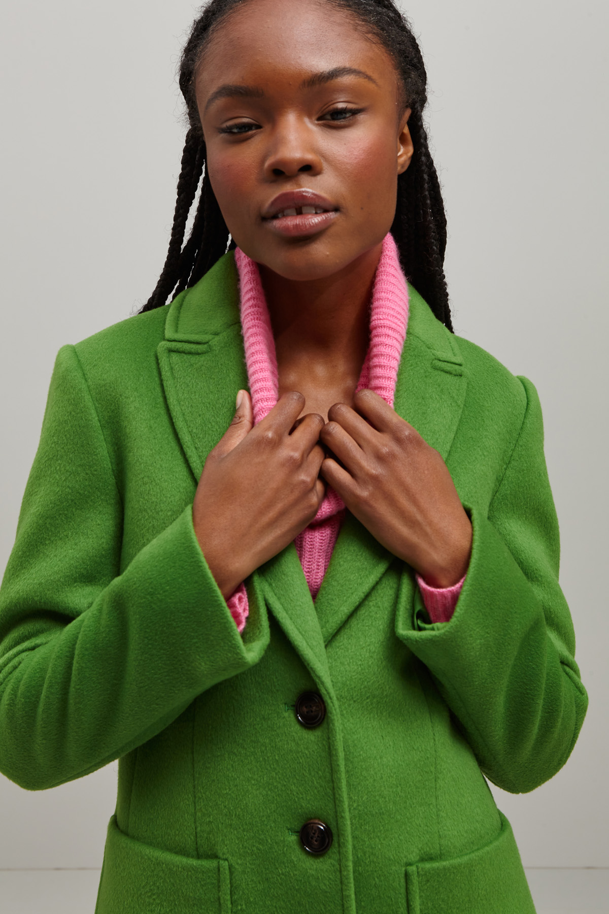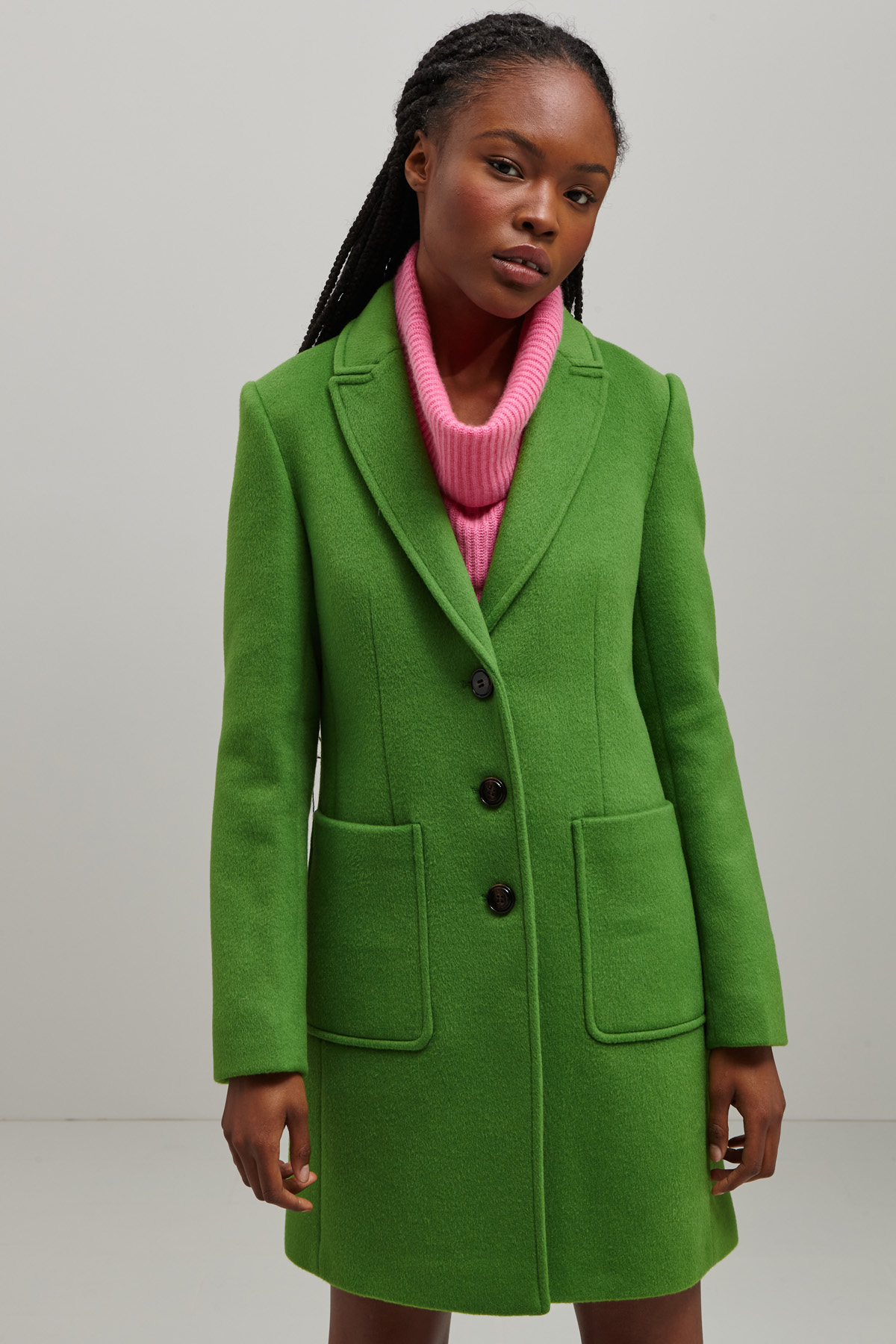 Cappotto dalla linea dritta realizzato in drap di misto lana con collo rever, maniche lunghe, tasche applicate e spacco nel retro. Allacciatura monopetto tramite bottoni a vista. Capo foderato.