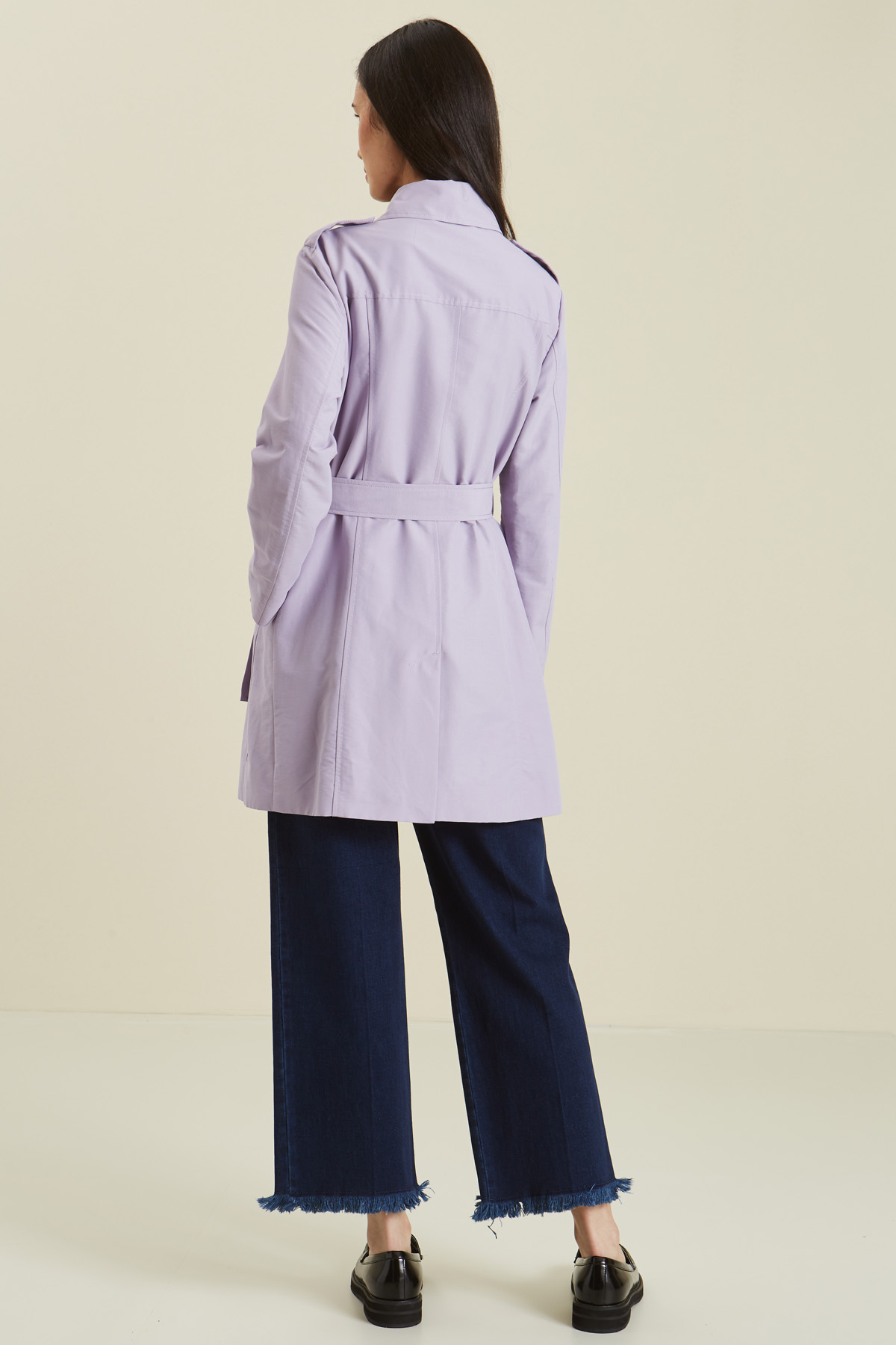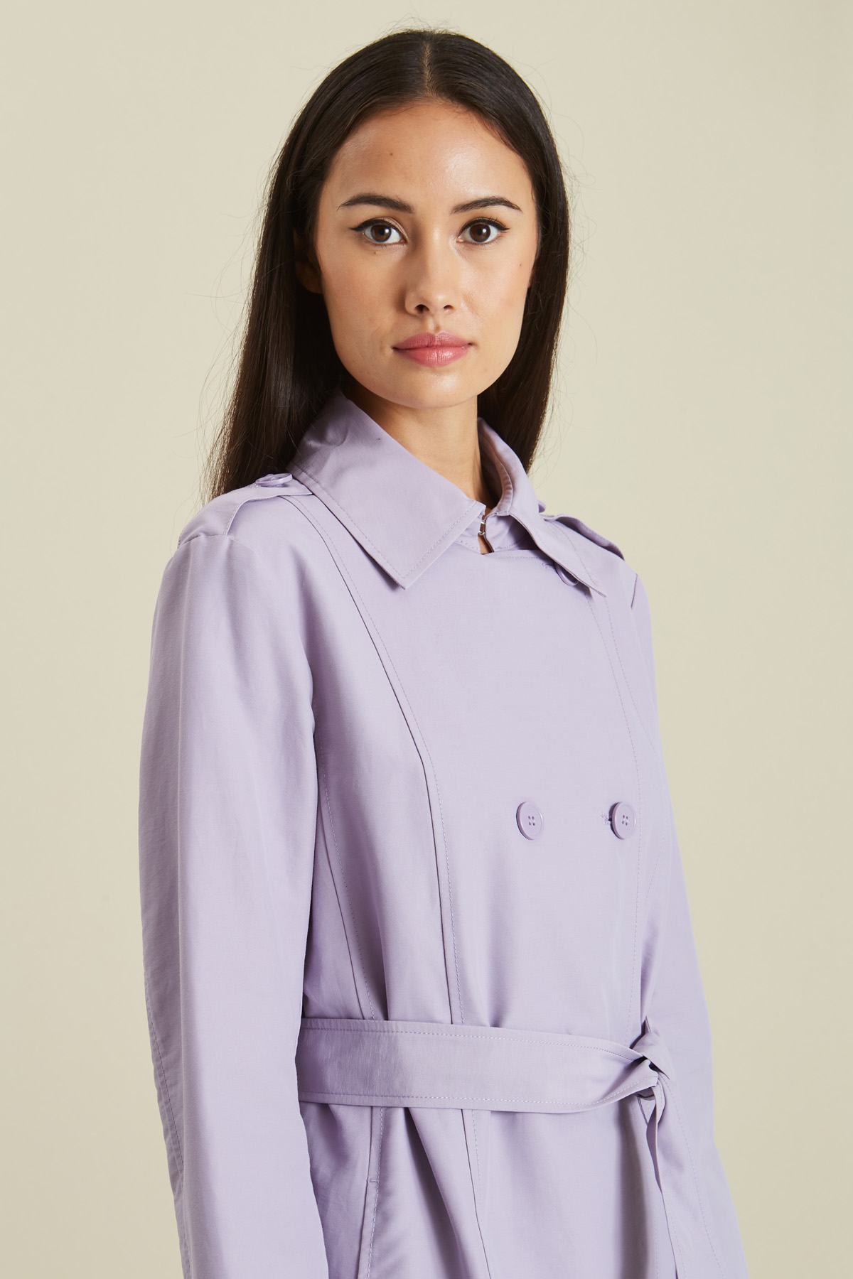 Trench dalla linea svasata realizzato in faille, con collo a camicia, dettaglio di gancio al collo e alamari sulle spalle, tasche a filetto laterali e chiusura doppiopetto a bottoni. Modello foderato, con passanti in vita e cintura coordinata.